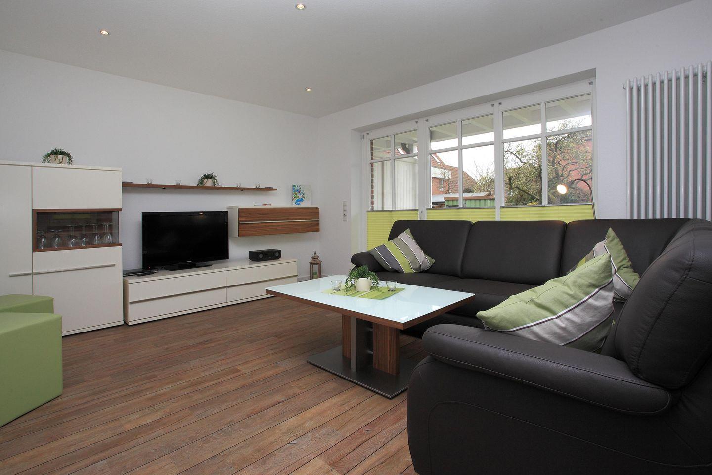 Bereits beim Betreten der Wohnung erleben Sie eine behagliche Atmosphäre: Der gemütliche Wohnbereich verfügt über ein hochwertiges Ledersofa, Flachbild-TV, DVD-Player und eine moderne Musikanlage. Ob gemütliche Filmabende, gesellige Spielrunden oder entspannte Lesestunden – hier fühlt sich die ganze Familie wohl.