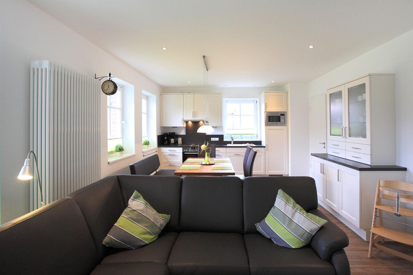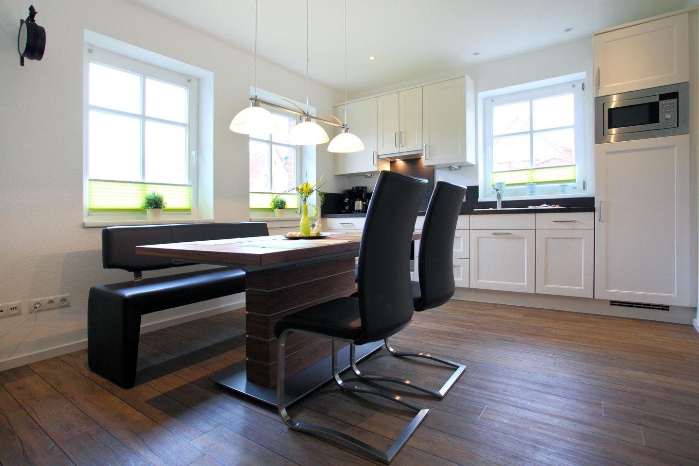 In der voll ausgestatteten Küche, die keine Wünsche offenlässt, macht gemeinsames Kochen und Essen einfach Freude. Von Cerankochfeld und Backofen über Mikrowelle und Geschirrspüler bis hin zu Kaffeemaschine, Espressomaschine und Senseo-Maschine ist alles vorhanden. Der großzügige Esstisch lädt zum gemeinsamen Essen und Beisammensein ein.