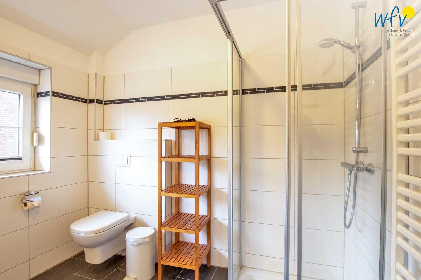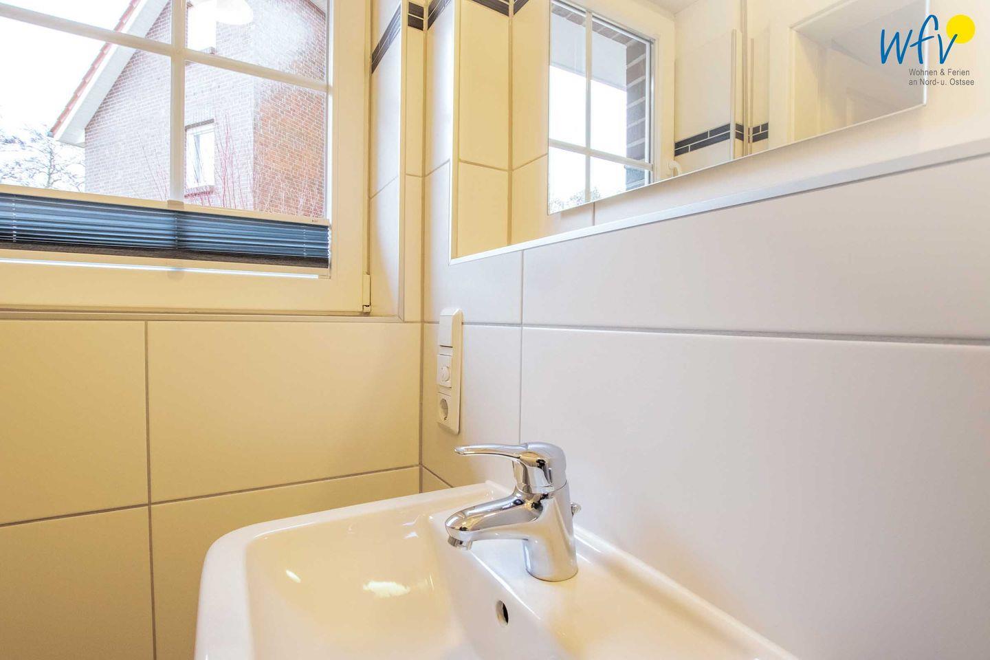 Zwei moderne Tageslichtbäder sowie ein zusätzliches Gäste-WC (EG) ermöglichen eine entspannte Nutzung bei einem Urlaub mit mehreren Personen. Das Bad im OG ist mit zwei Waschtischen, WC und Dusche ausgestattet, in dem Bad im DG befinden sich ebenfalls eine Dusche und ein WC sowie Waschmaschine und Trockner.