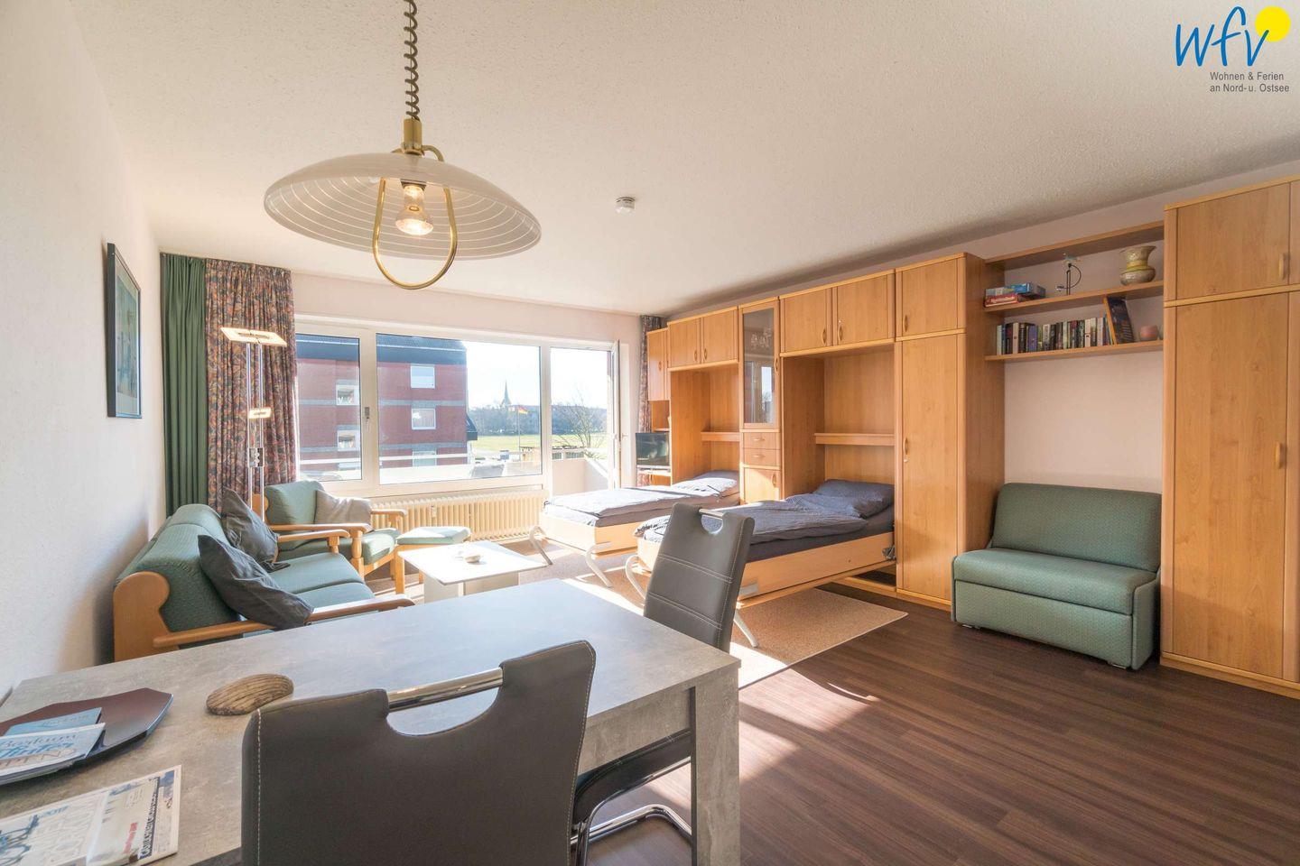 In dem geräumigen Wohn-/Schlafraum können Sie wunderbar erholsame Urlaubsmomente verbringen! Morgens am Esstisch den Tag mit einem ausgedehnten Ferienfrühstück starten und abends in der Sitzecke mit TV (60x40 cm) einen guten Film schauen. Auch auf dem schönen Südbalkon lassen sich traumhafte Zeiten genießen. Von hier aus haben Sie eine schöne Sicht auf die Salzwiesen sowie auf den alten und den neuen Leuchtturm.