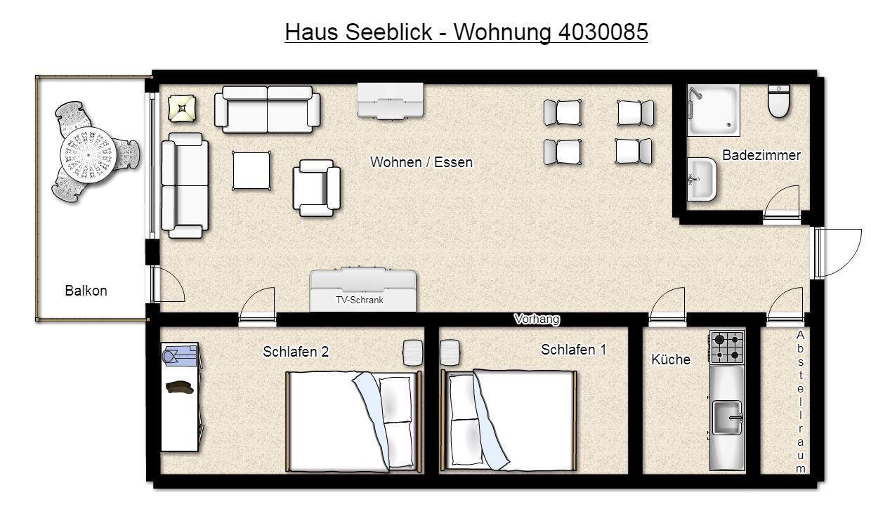 In den zwei separaten Schlafzimmern befindet sich jeweils ein komfortables Doppelbett (140 x 200). Bitte beachten Sie, dass einer der Schlafräume nicht durch eine Türe, sondern durch einen Vorhang von der restlichen Wohnung getrennt wird. Gerne stellen wir Ihnen auf Anfrage ein Kinderbett und einen Hochstuhl gegen eine kleine Gebühr zur Verfügung.
