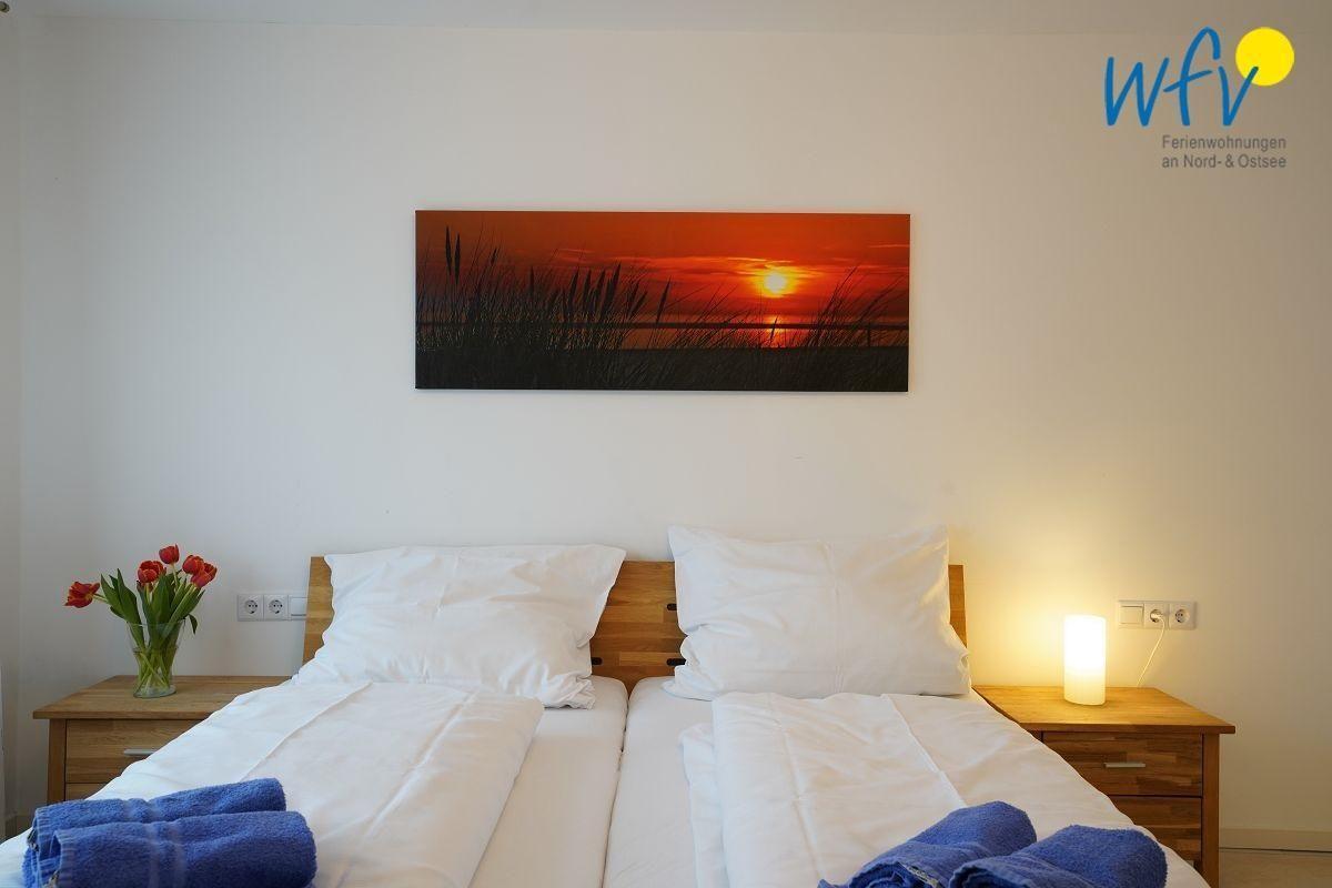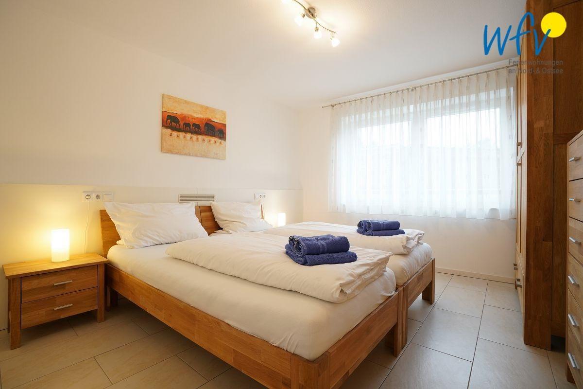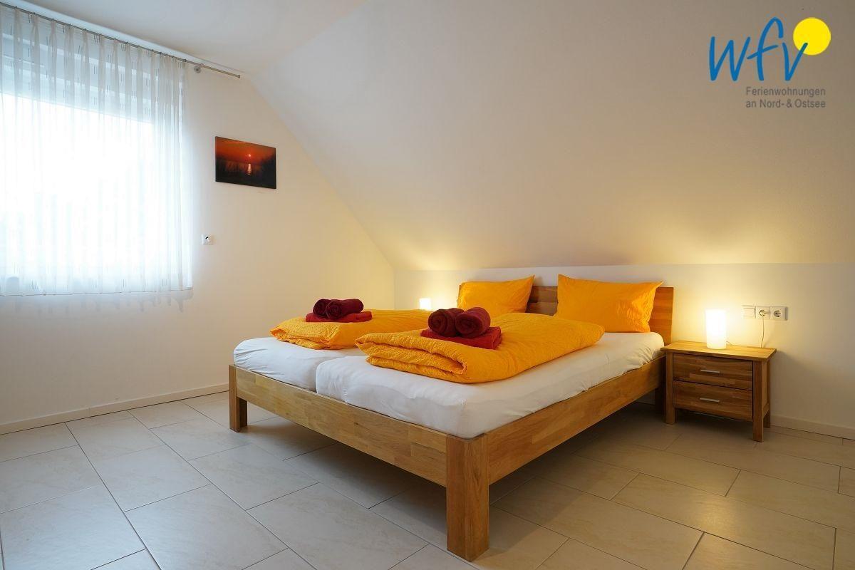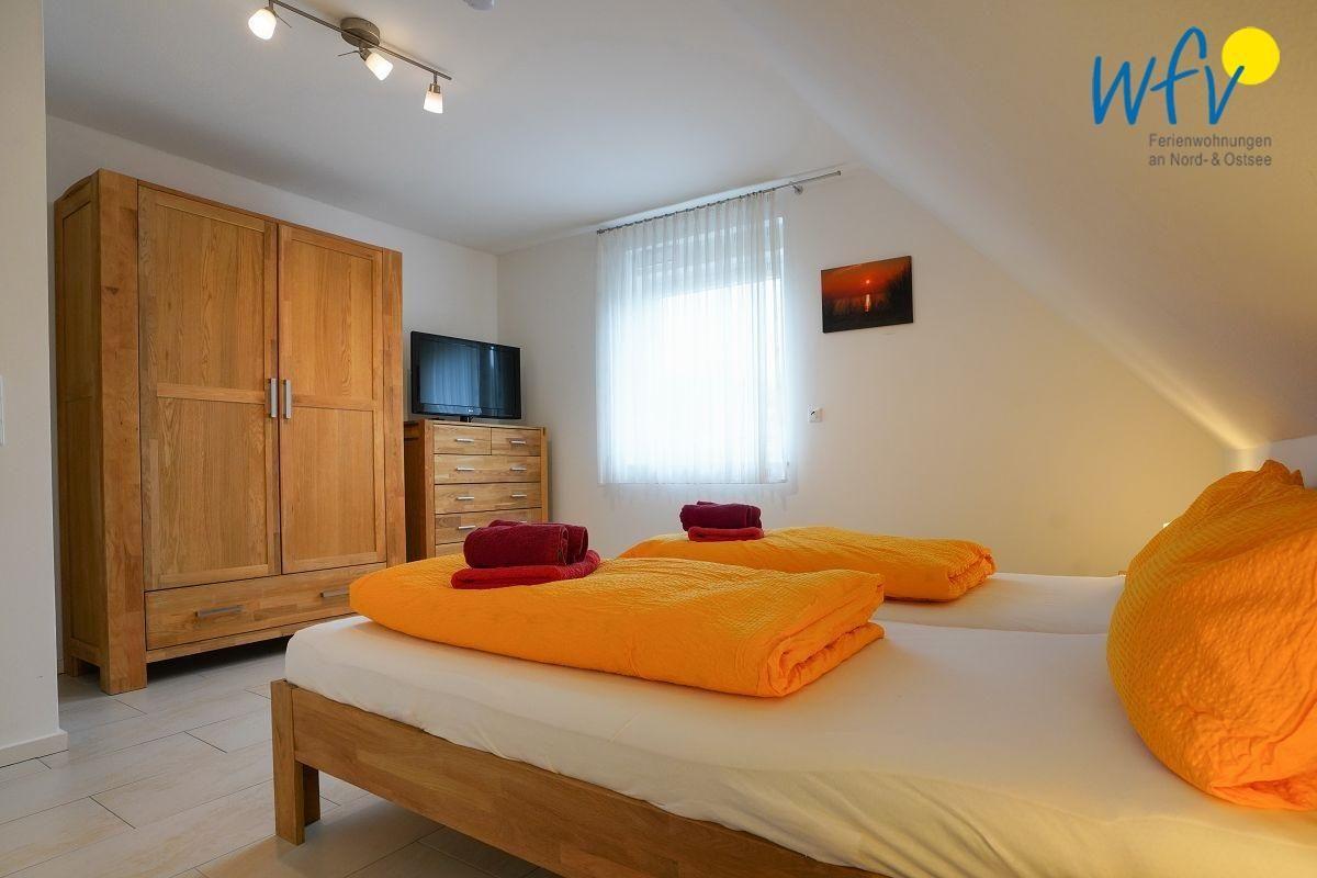 Die vier separaten Schlafzimmer sind auf zwei Etagen aufgeteilt. Zwei befinden sich im Erdgeschoss, zwei weitere Schlafräume im Dachgeschoss der Ferienwohnung. Alle Zimmer sind mit jeweils einem Doppelbett ausgestattet. Zwei der Betten lassen sich auch einzeln stellen. Große Kleiderschränke, Kommoden sowie ein Flachbild-Fernseher vervollständigen jeweils die komfortable Ausstattung.