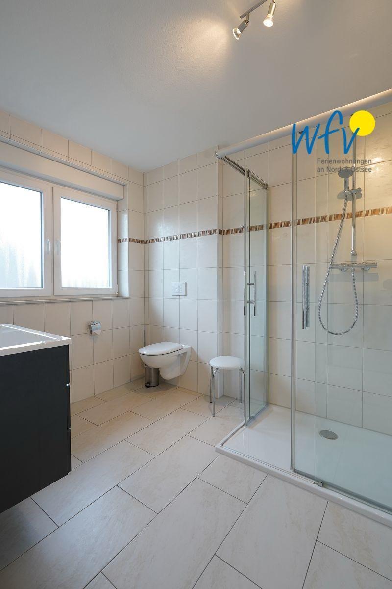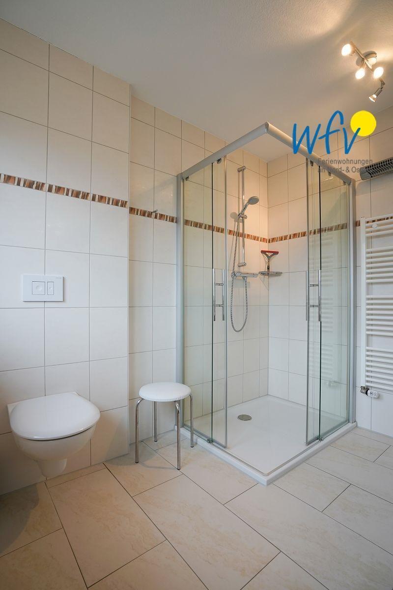Zwei moderne Badezimmer mit Dusche, Waschbecken, Unterschrank und Infrarot-Strahler ermöglichen angenehme Ausweichmöglichkeiten.
