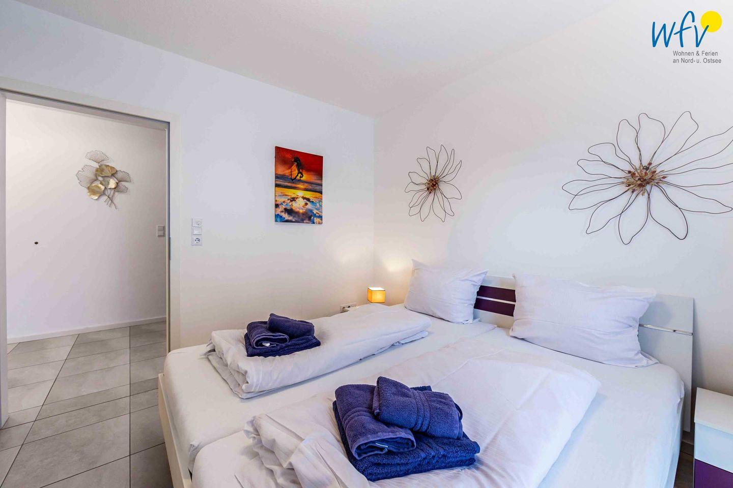 Drei der vier separaten Schlafzimmer sind in der Ferienwohnung "Muschelsucher" mit einem bequemen Doppelbett ausgestattet. Das vierte Schlafzimmer verfügt über ein Hochbett.