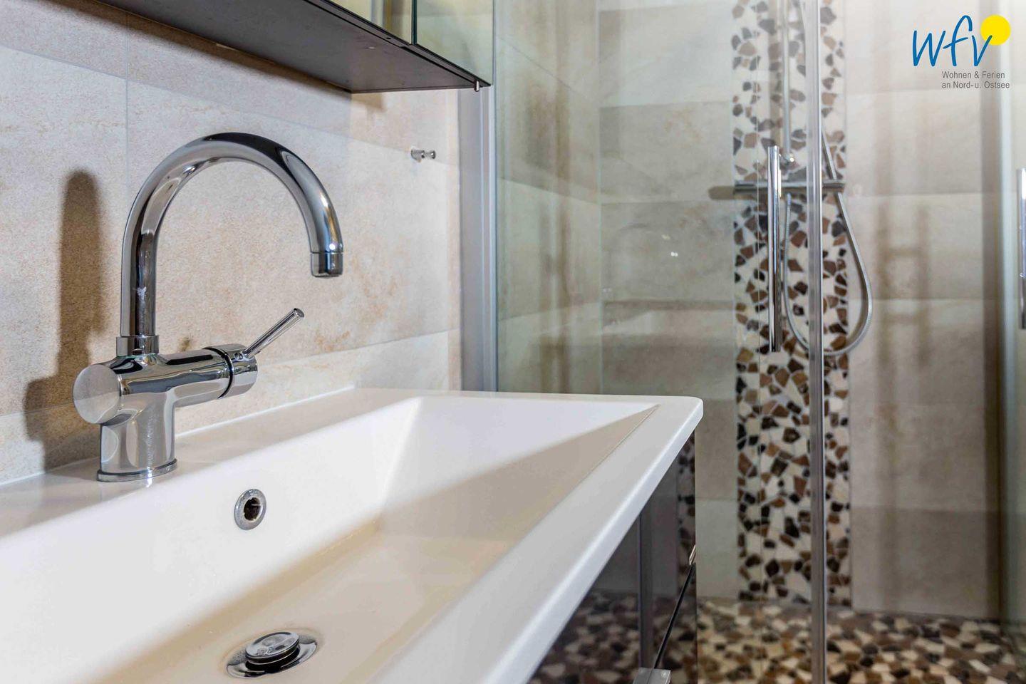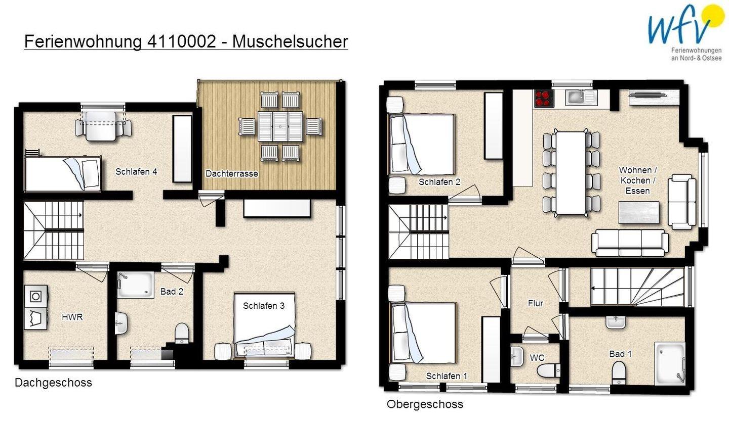 Großzügige 125 m² Wohnfläche, aufgeteilt über zwei Etagen (OG+DG), ermöglichen einen angenehmen Aufenthalt mit Ausweichmöglichkeiten. Die Ferienwohnung besitzt drei Bäder - jeweils mit Dusche und WC.