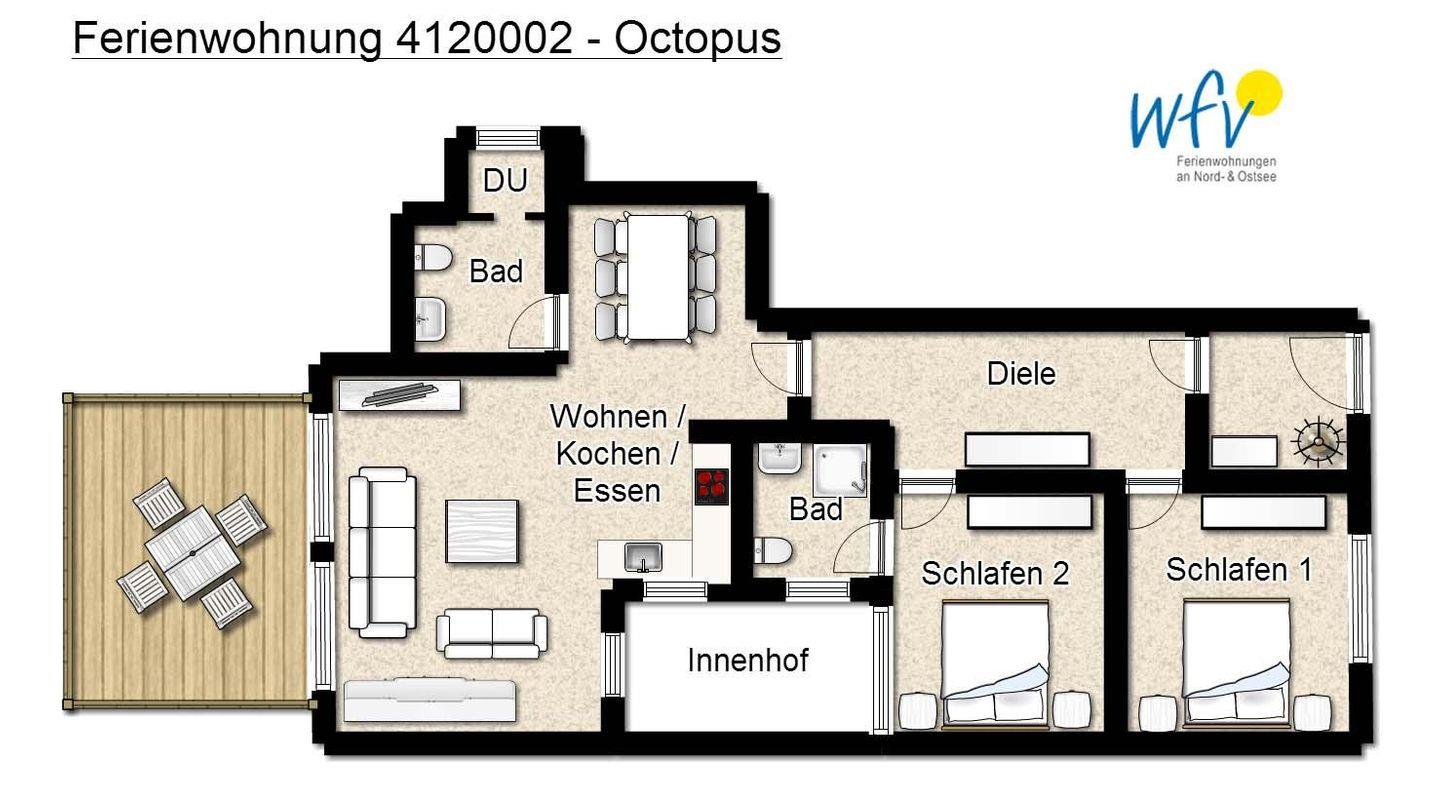 Planen Sie einen Familienurlaub oder einen Urlaub mit Freunden? Die Ferienwohnung „Octopus“ auf Borkum mit zwei separaten Schlafzimmern (mit zwei Doppelbetten), moderner Einrichtung und herrlicher Terrasse bietet ein tolles Urlaubsdomizil für vier Personen.