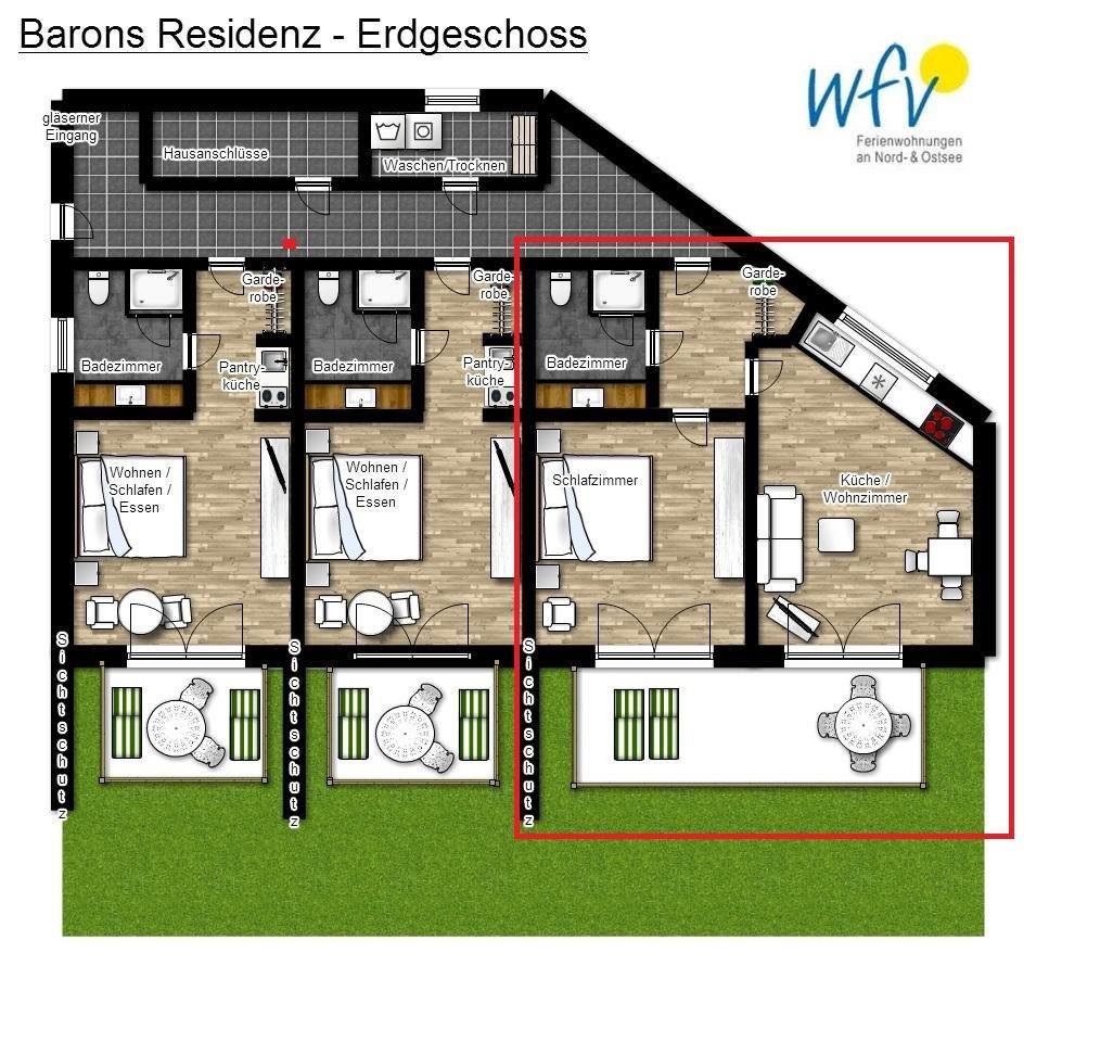 Das 49 m² große Apartment Nr.3 befindet sich im Erdgeschoss der "Barons Residenz" und verfügt über ein Schlafzimmer, ein Wohnzimmer mit integrierter Küche, einen Vorraum mit Garderobe sowie über eine Terrasse.