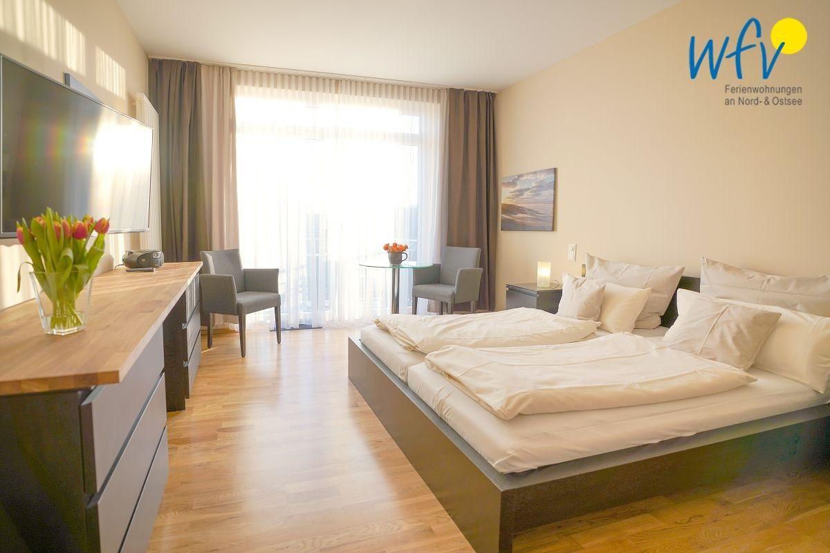 Der Wohn-/ Schlafraum der Borkumer Ferienwohnung ist u.a. mit einer Sitzgruppe (runder Tisch u. zwei Stühle) und einem Schreibplatz sowie mit einem TV, einem Radio mit CD+USB und freiem WLAN ausgestattet. Zudem befinden sich hier ein Doppelbett (160 x 200 cm) mit zwei hochwertigen Qualitätsmatratzen (mit Matratzenschoner und Lattenrost), zwei Nachttische mit Leselampe und zwei Kommoden.