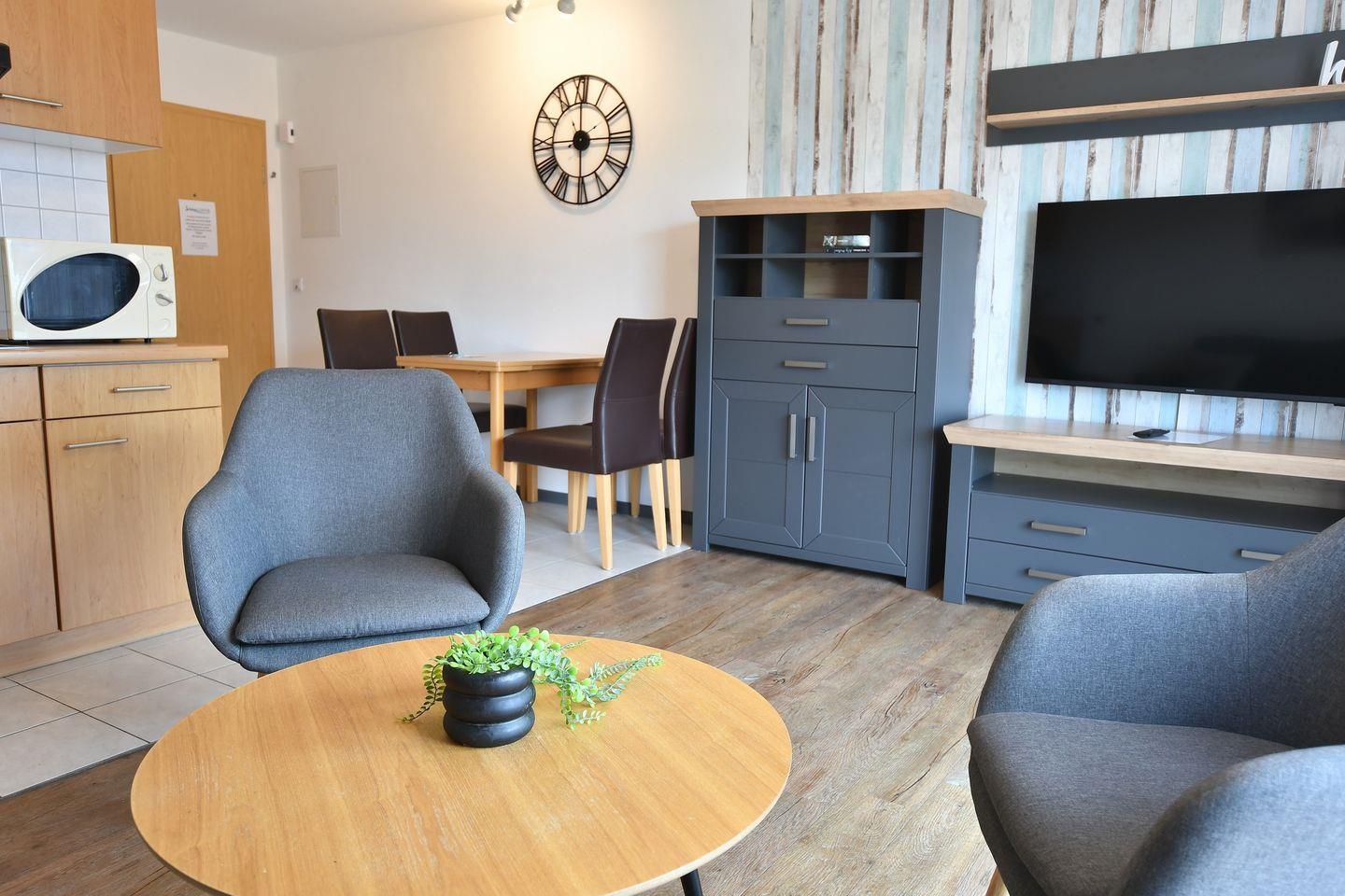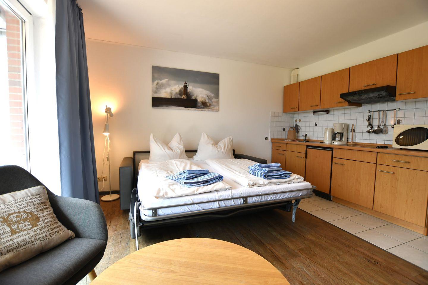 Diese geräumige Wohnung mit einem nach Süden ausgerichteten Balkon (inkl. Gartenbestuhlung) mit Blick auf den neuen Leuchtturm hat einen großen Wohnraum mit moderner Schlafcouch, Sat-TV mit Radio, kleiner Küche und Essplatz. Die Küchenzeile ist mit einem 4-Platten Herd, Kühlschrank ohne Gefrierfach, Kaffeemaschine, Toaster, Wasserkocher ausgestattet und verfügt über ausreichend Kochgeschirr. Im Schlafzimmer können 2 Personen in einem Doppelbett schlafen und ein Bad mit Dusche und WC vervollständigen das Bild. Eine Waschmaschine und Trockner sind im gemeinschaftlich nutzbaren Waschraum vorhanden. Ein Reise-Kinderbett und Hochstuhl für unsere jüngsten Besucher stellen wir Ihnen gerne kostenlos zur Verfügung.