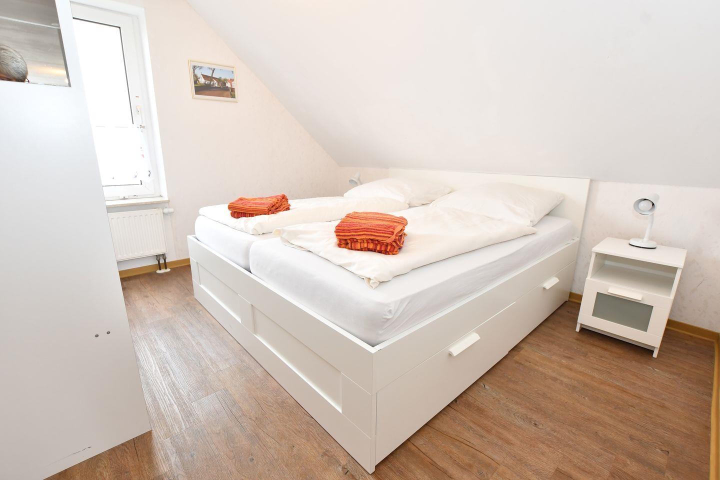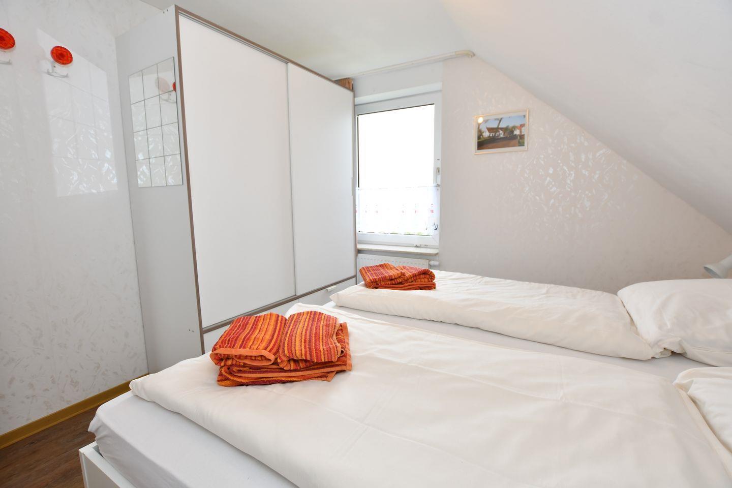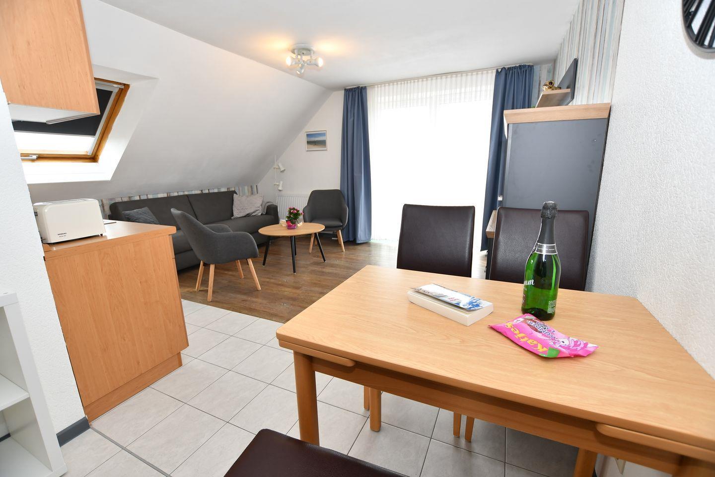 Diese geräumige Wohnung mit einem nach Süden ausgerichteten Balkon (inkl. Gartenbestuhlung) mit Blick auf den neuen Leuchtturm hat einen großen Wohnraum mit moderner Schlafcouch, Sat-TV mit Radio, kleiner Küche und Essplatz. Die Küchenzeile ist mit einem 4-Platten Herd, Kühlschrank ohne Gefrierfach, Kaffeemaschine, Toaster, Wasserkocher, Eierkocher ausgestattet und verfügt über ausreichend Kochgeschirr. Im Schlafzimmer können 2 Personen in einem Doppelbett schlafen und ein Tageslicht-Bad mit Dusche und WC vervollständigen das Bild. Eine Waschmaschine und Trockner sind im gemeinschaftlich nutzbaren Waschraum vorhanden. Ein Reise-Kinderbett und Hochstuhl für unsere jüngsten Besucher stellen wir Ihnen gerne kostenlos zur Verfügung.