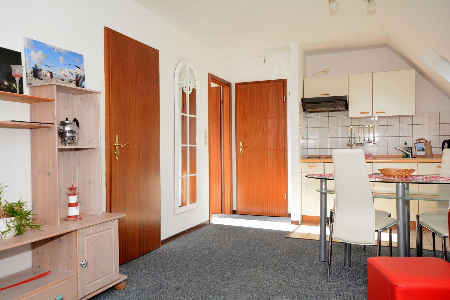 Die mit Teppichboden ausgestattet Wohnung (45qm) in der ersten Etage verfügt über ein Schlafzimmer mit Doppelbett, Wohnzimmer mit Schlafcouch, gut ausgestattete Küchenzeile mit 4-Platten-Herd, Backofen, Mikrowelle, Kaffeemaschine, Senseo Kaffeepad-Maschine, Toaster, etc, Essecke, TV mit Radio.
