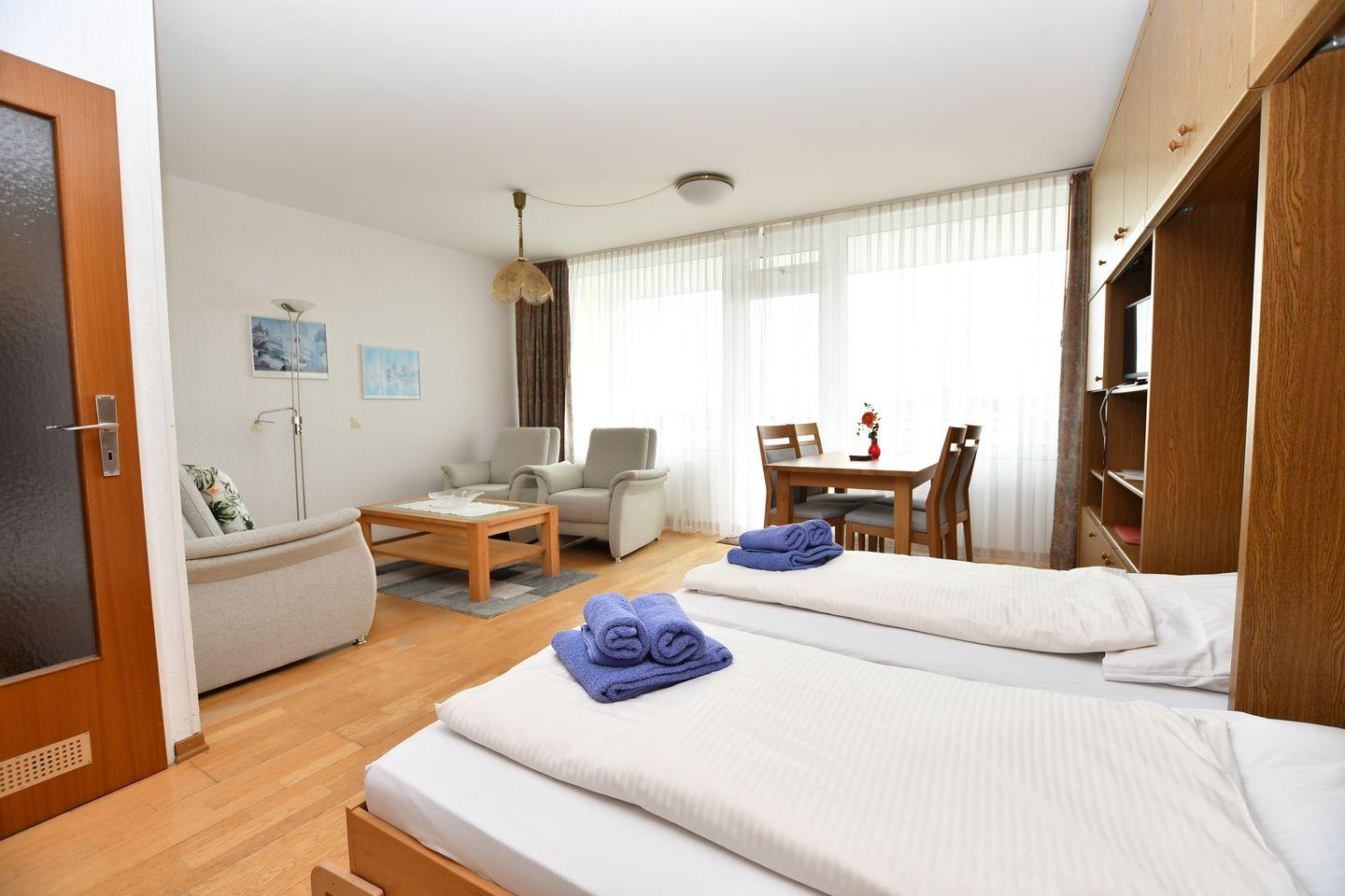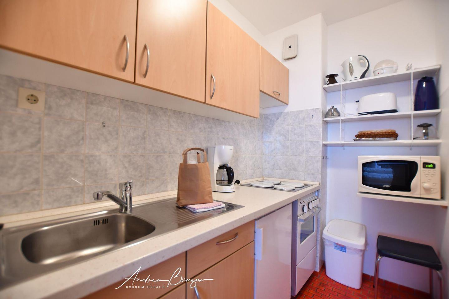 Genießen Sie Ruhe und den herrlichen Blick von Ihrem Balkon in der dritten Etage auf das Meer bis zum Eemshaven, das Gezeitenland und einen kleinen Teil Borkums. Der große freundlich helle Wohnraum hat eine Sitzecke mit Couchgarnitur, einen Essplatz direkt am Fenster und 2 Schrankbetten. Eine kleine Küche mit 4 Platten Herd und Backofen , Kühlschrank, Mikrowelle, Kaffeemaschine, Toaster sowie ausreichend Geschirr schließt sich an den Wohnraum an. Die Belüftung erfolgt durch eine sehr gute zentrale Lüftungsanlage. Der große Südbalkon ist mit Tisch und Stühlen ausgestattet. Fahrstuhl im Haus!
