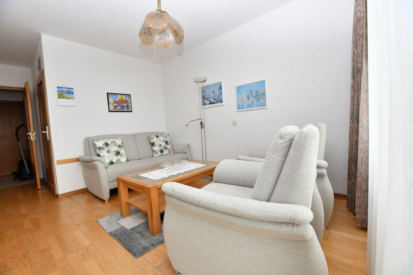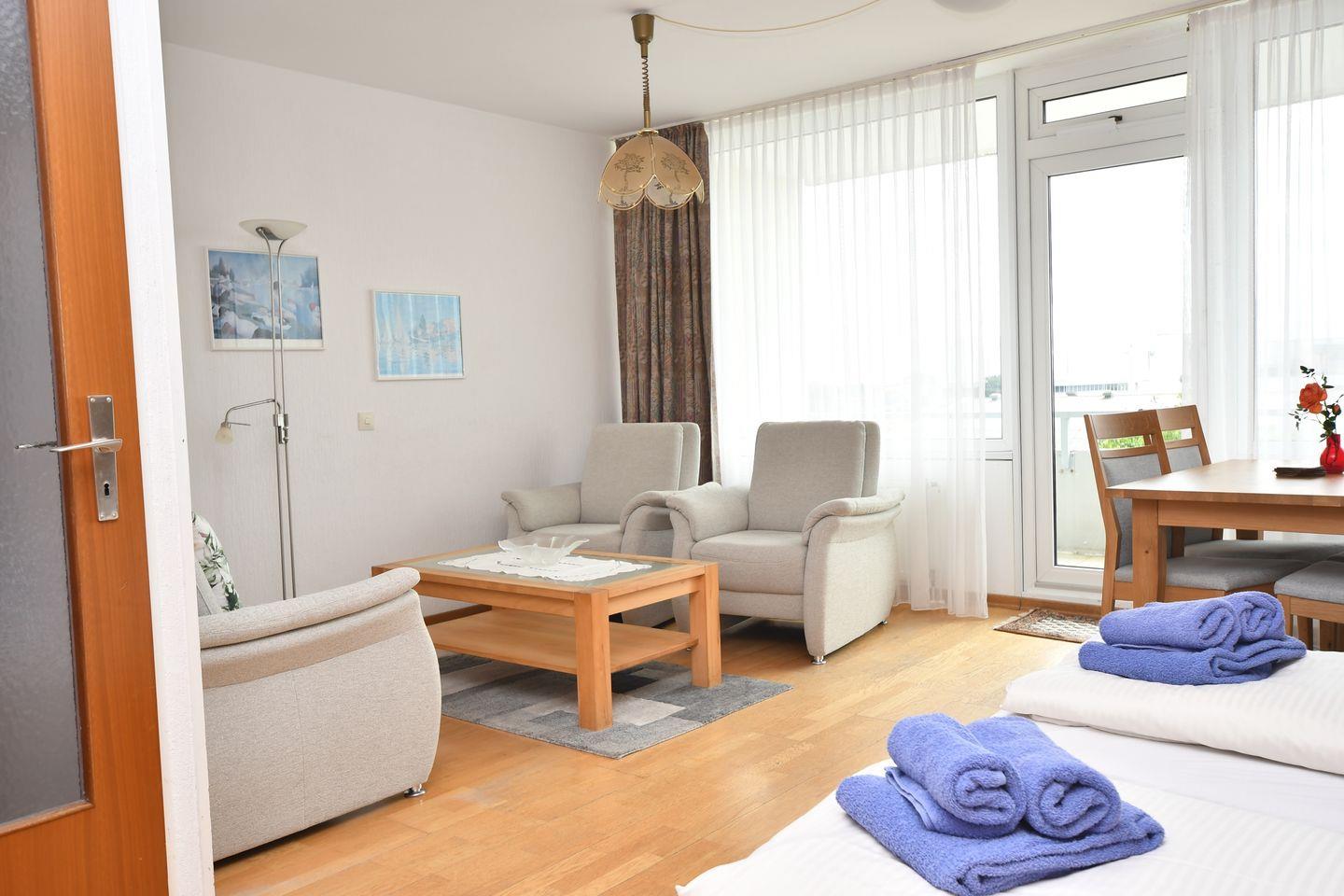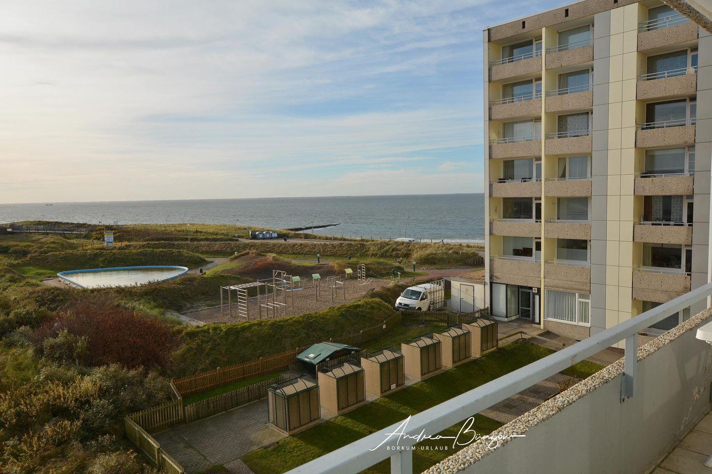 Helle Ferienwohnung mit Meerblick auf Borkum, Balkon, Küche und komfortabler Ausstattung für erholsame Tage.