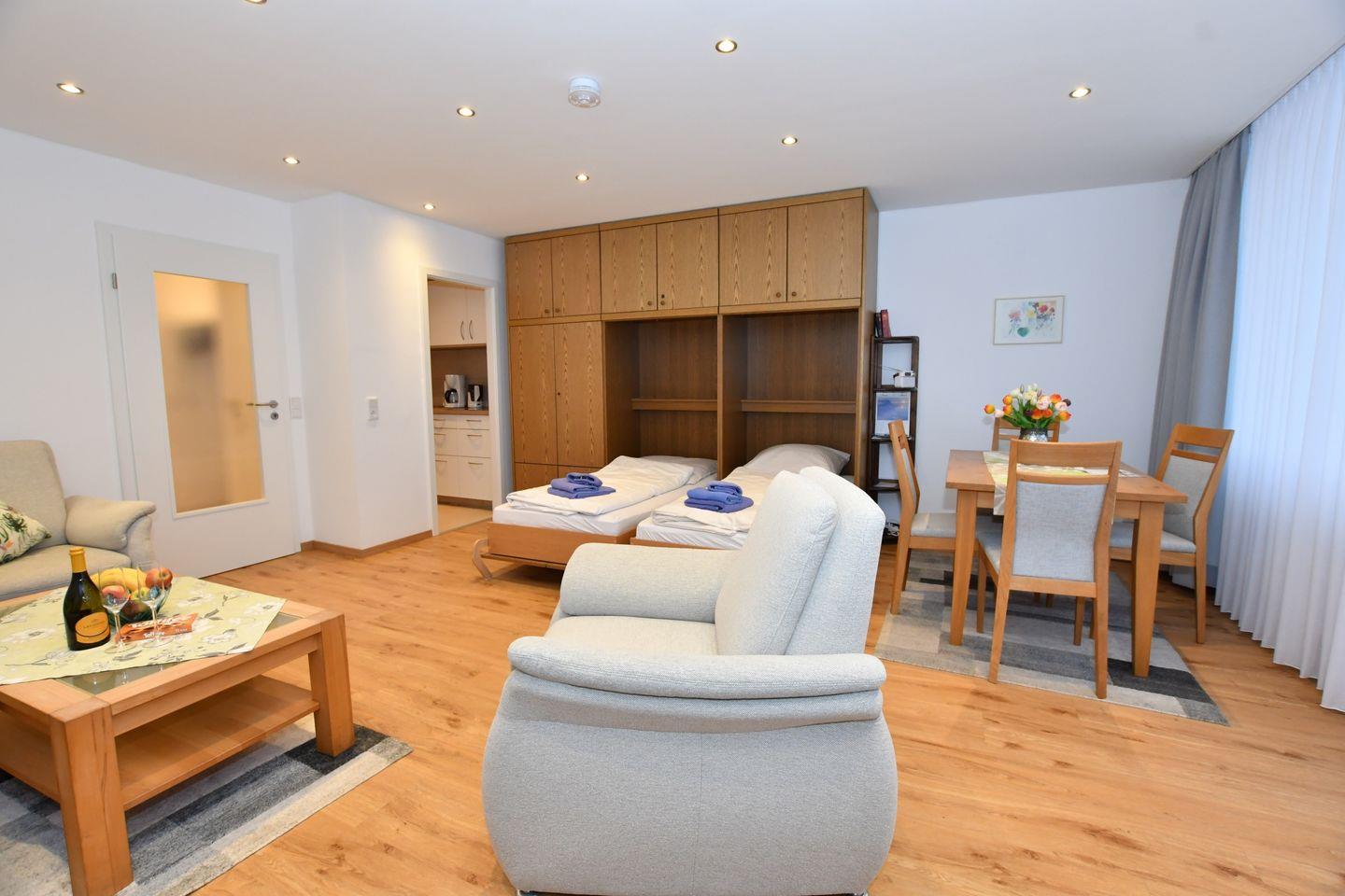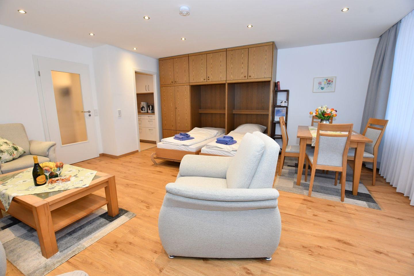 mit einem Wohnzimmer mit Schrankbetten,