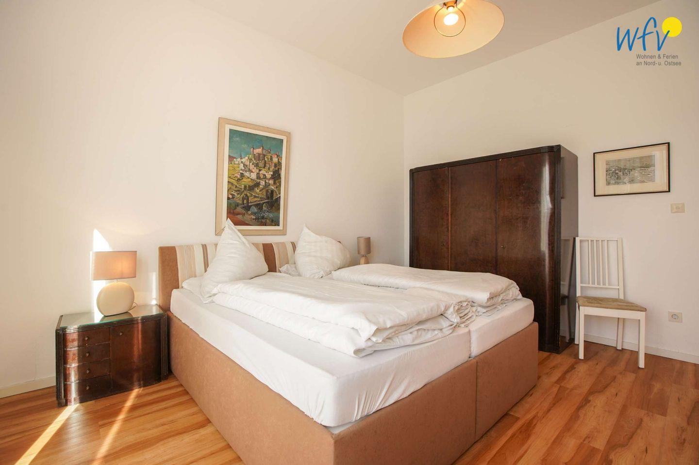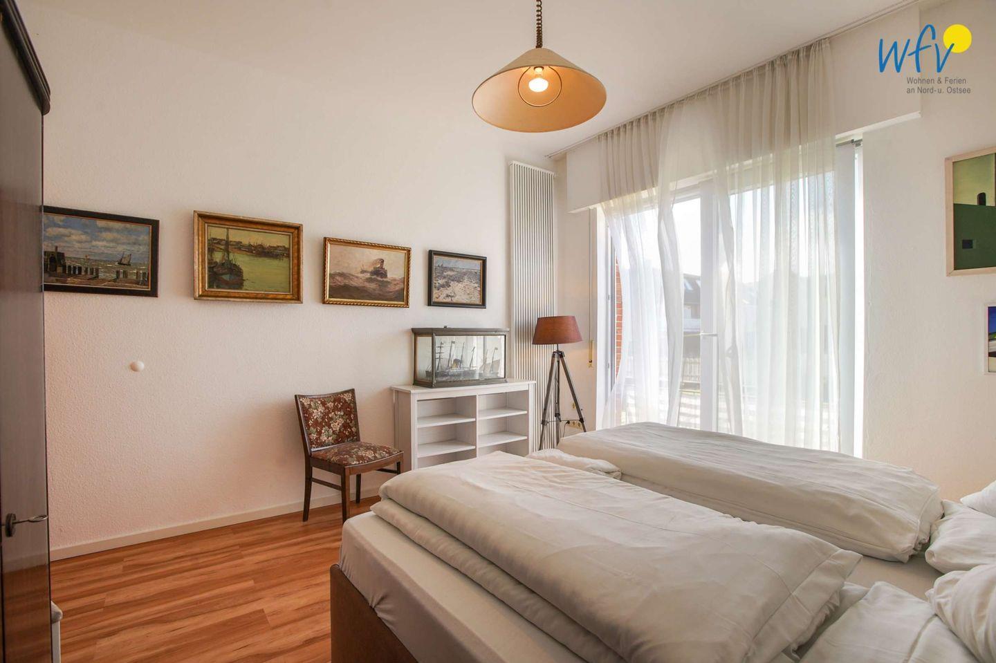 Das separate Schlafzimmer der Borkumer Ferienwohnung ist mit einem hochwertigen Doppelbett ausgestattet. Im Wohnzimmer befinden sich zwei Schlafcouchen, auf denen zwei weitere Personen übernachten können.