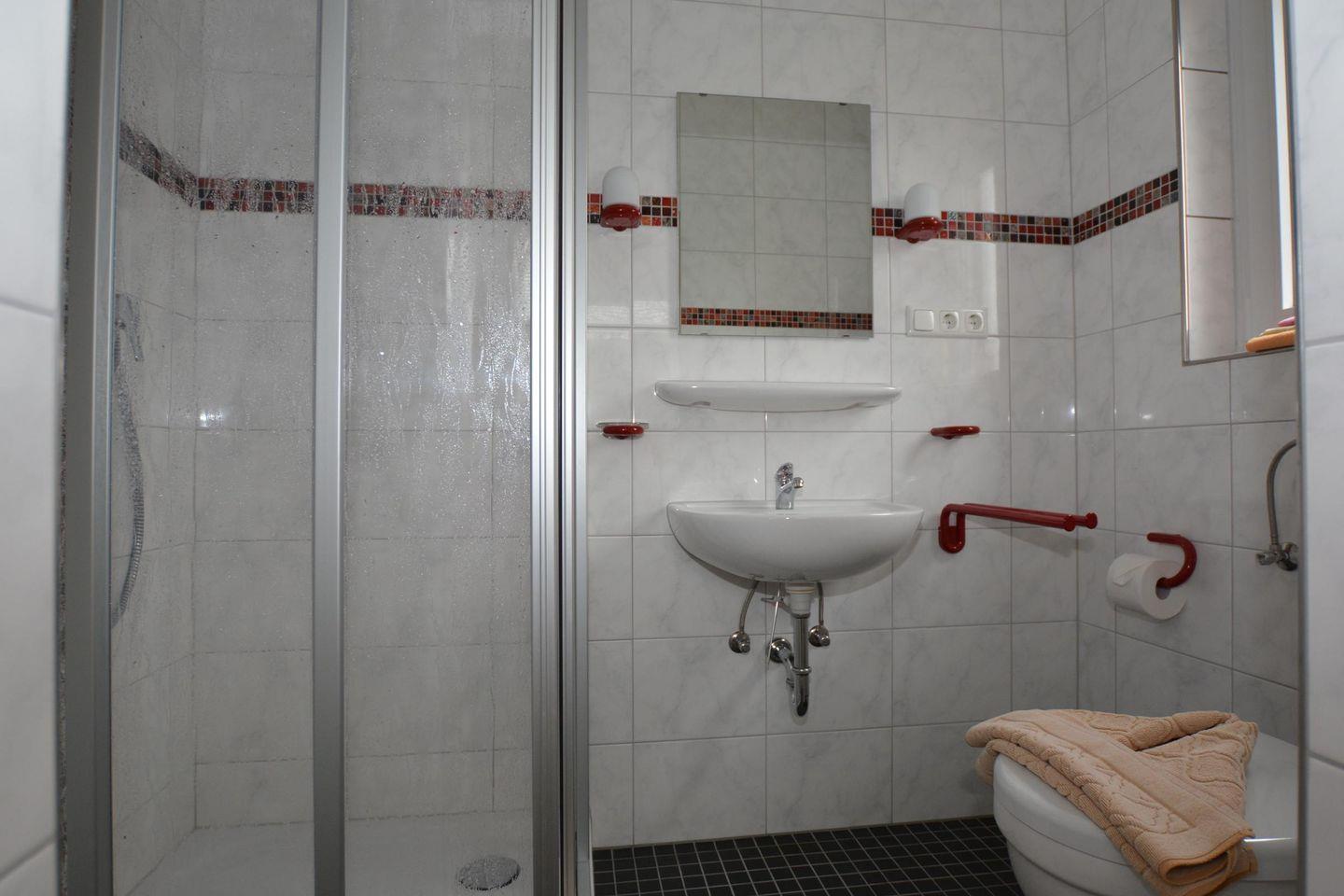 Das Bad hat eine Dusche mit tiefem Einstieg und WC. Ein Schlafzimmer hat ein Doppelbett (Matratzengröße 90x200) und ein Kinderbett, das zweite Schlafzimmer zwei auseinanderstehende Betten