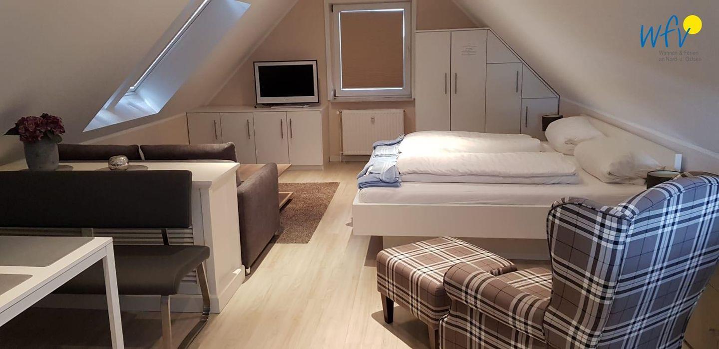 In dem großzügigen Wohn-/Schlafraum mit Essecke und integrierter Pantry-Küche können Sie vollkommen entspannen, gemütliche Abende verbringen oder gemeinsam kochen. Ein moderner Flachbildfernseher sowie kostenfreies Wlan sorgen für zusätzlichen Wohnkomfort.