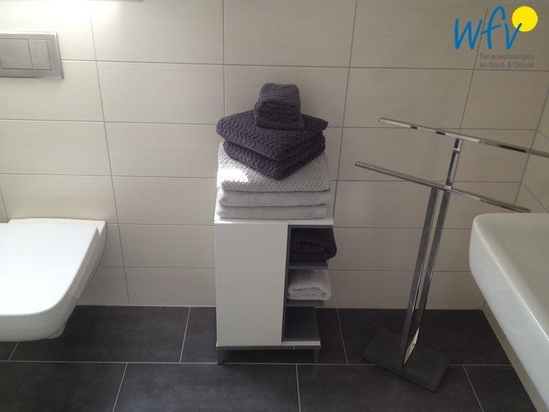 Das moderne Bad der Ferienwohnung verfügt über eine komfortable Ausstattung mit Waschbecken, WC, Dusche und Handtuchheizkörper.