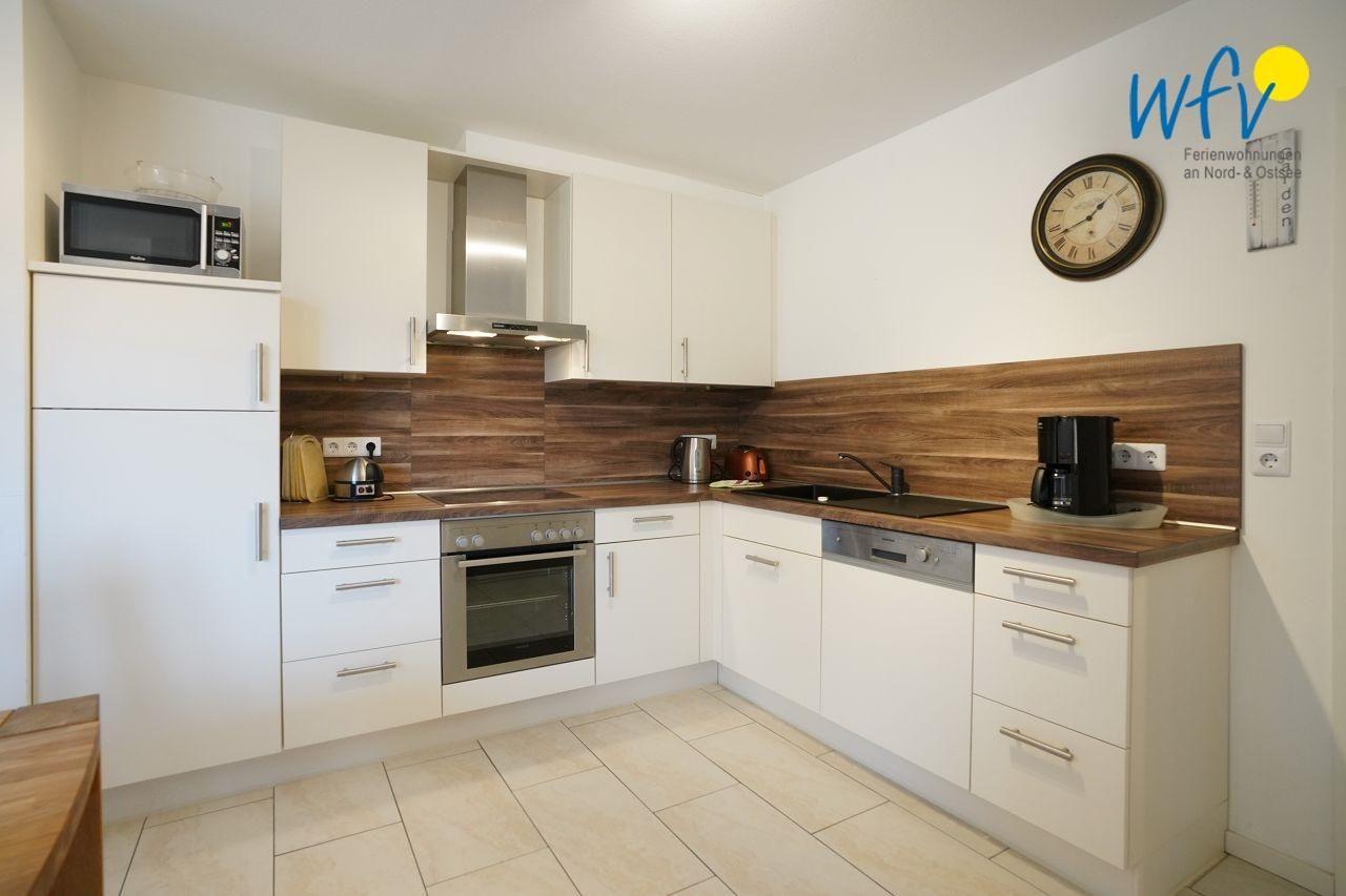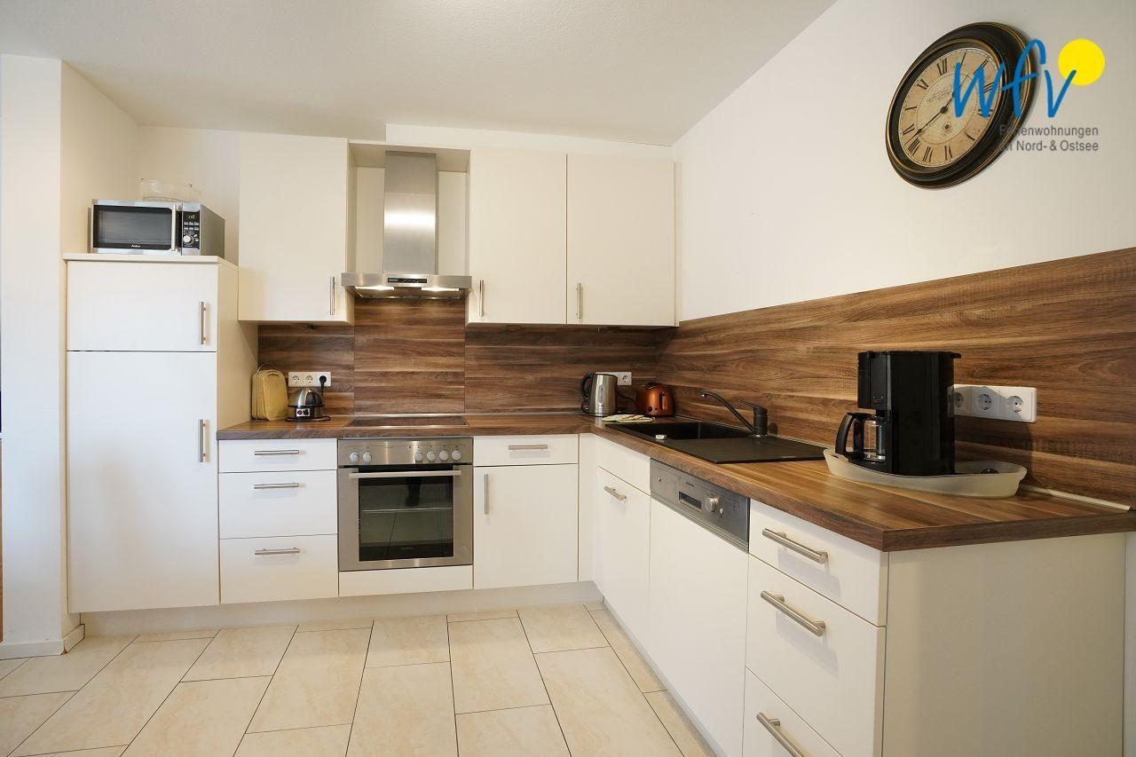 Die zum Wohnbereich hin offene Küche besitzt eine komfortable Ausstattung mit 4-Platten Ceran-Kochfeld, Backofen, Spülmaschine und Mikrowelle sowie diversen Küchengeräten (Toaster, Kaffeemaschine, Eier – und Wasserkocher), sodass Sie sich bequem selbst verpflegen können.
