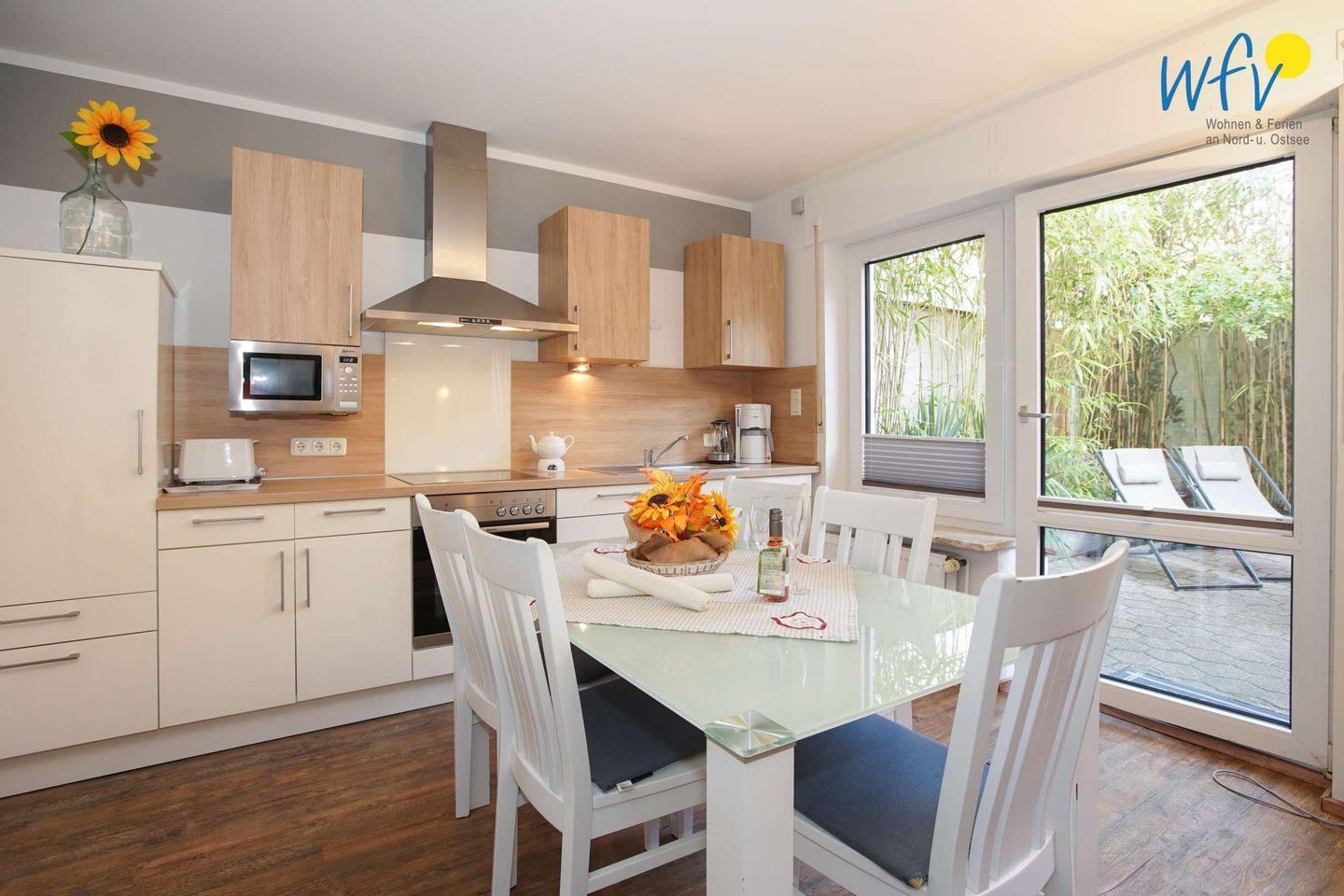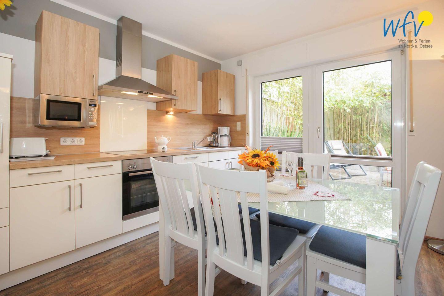 Eine top-ausgestattete Einbauküche (u.a. mit Ceranfeld, Backofen, Mikrowelle, Geschirrspüler, Kaffeemaschine und Wasserkocher) bietet angenehme Möglichkeiten zur Selbstverpflegung.