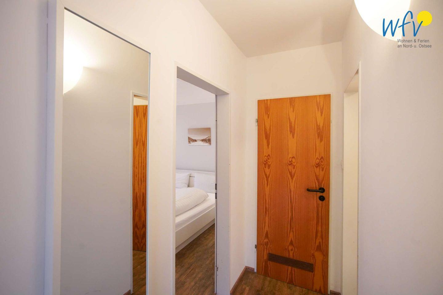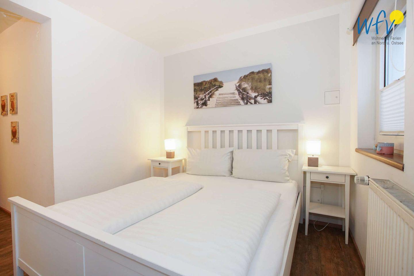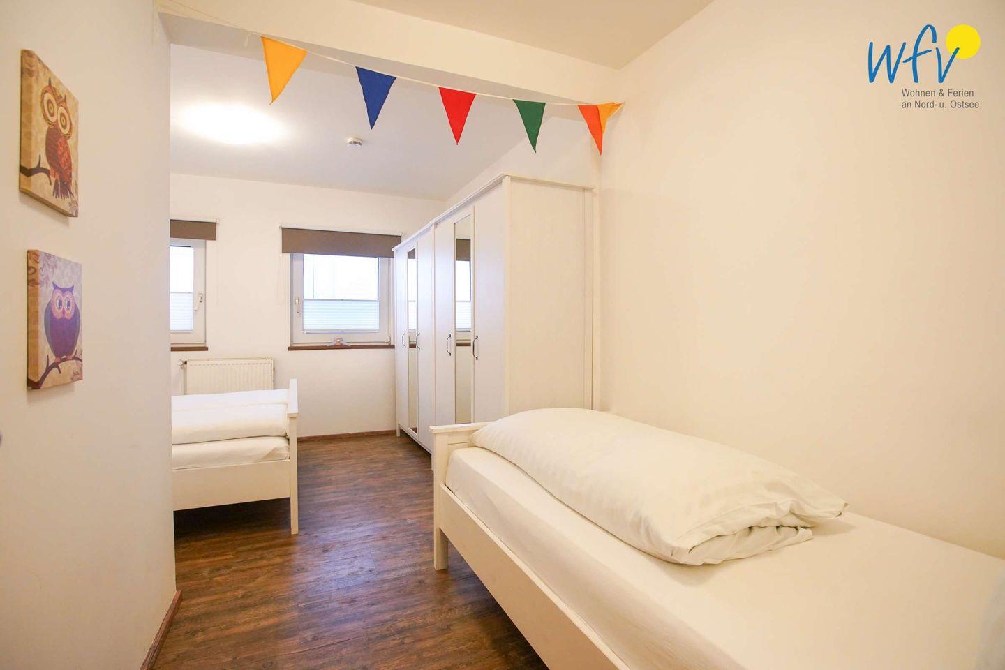 Die zwei separaten Schlafzimmer der Borkumer Ferienwohnung bieten Schlafmöglichkeiten für fünf Personen. Eines der Zimmer ist mit einem Doppelbett, einem Kleiderschrank und einem Flachbildfernseher ausgestattet. In dem anderen Schlafzimmer befinden sich ein Doppelbett, ein Einzelbett und ein Kleiderschrank für mehrere Personen.