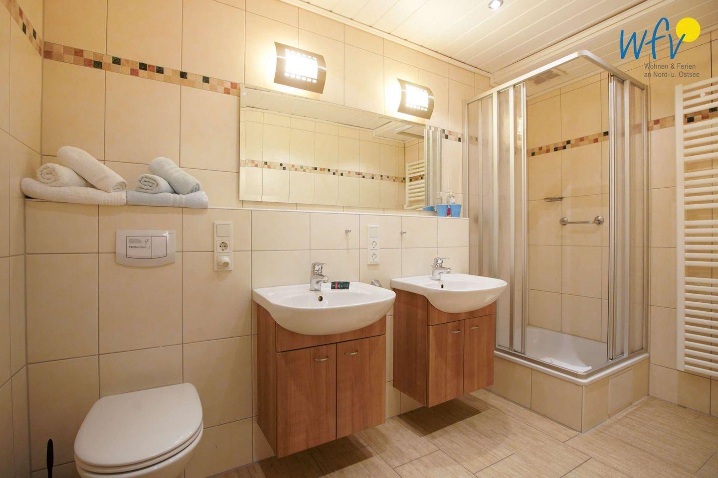 Das Badezimmer der Ferienwohnung verfügt über zwei Waschbecken, eine Dusche und ein WC. Ein Föhn gehört zur festen Ausstattung.