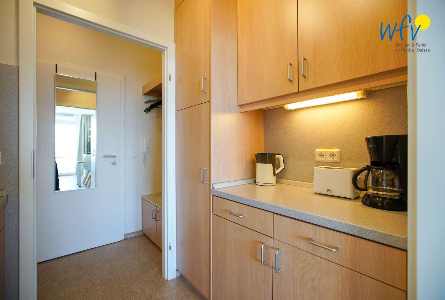 Die Küchenzeile mit kompletter Ausstattung (u.a. mit 2-Plattenherd, Kühlschrank mit Gefrierfach, Wasserkocher und Toaster) ermöglicht Ihnen eine bequeme Selbstverpflegung in Ihrem Urlaub auf Borkum. Kaffeegourmets kommen in den Genuss einer Senseo-Maschine.