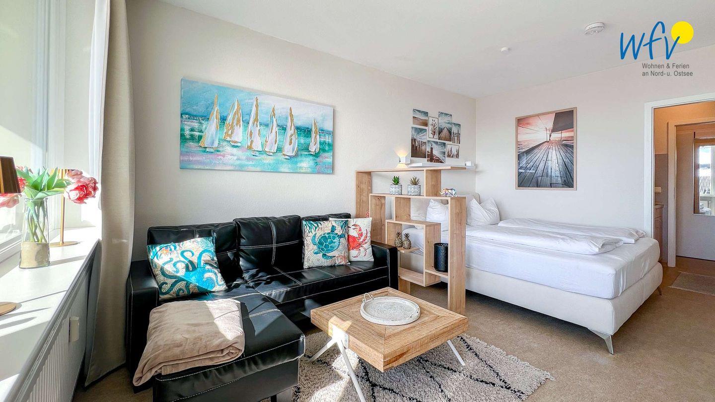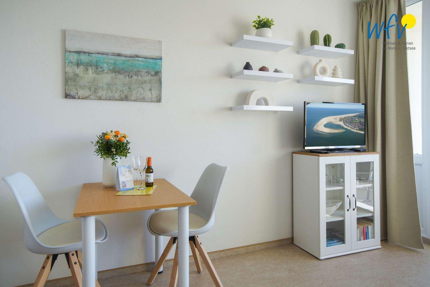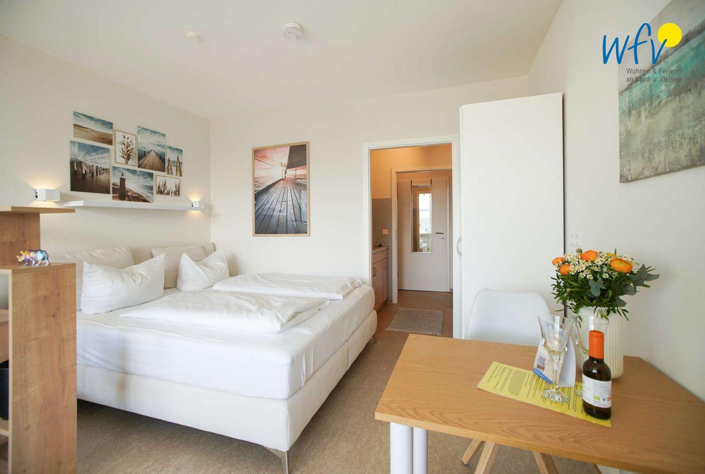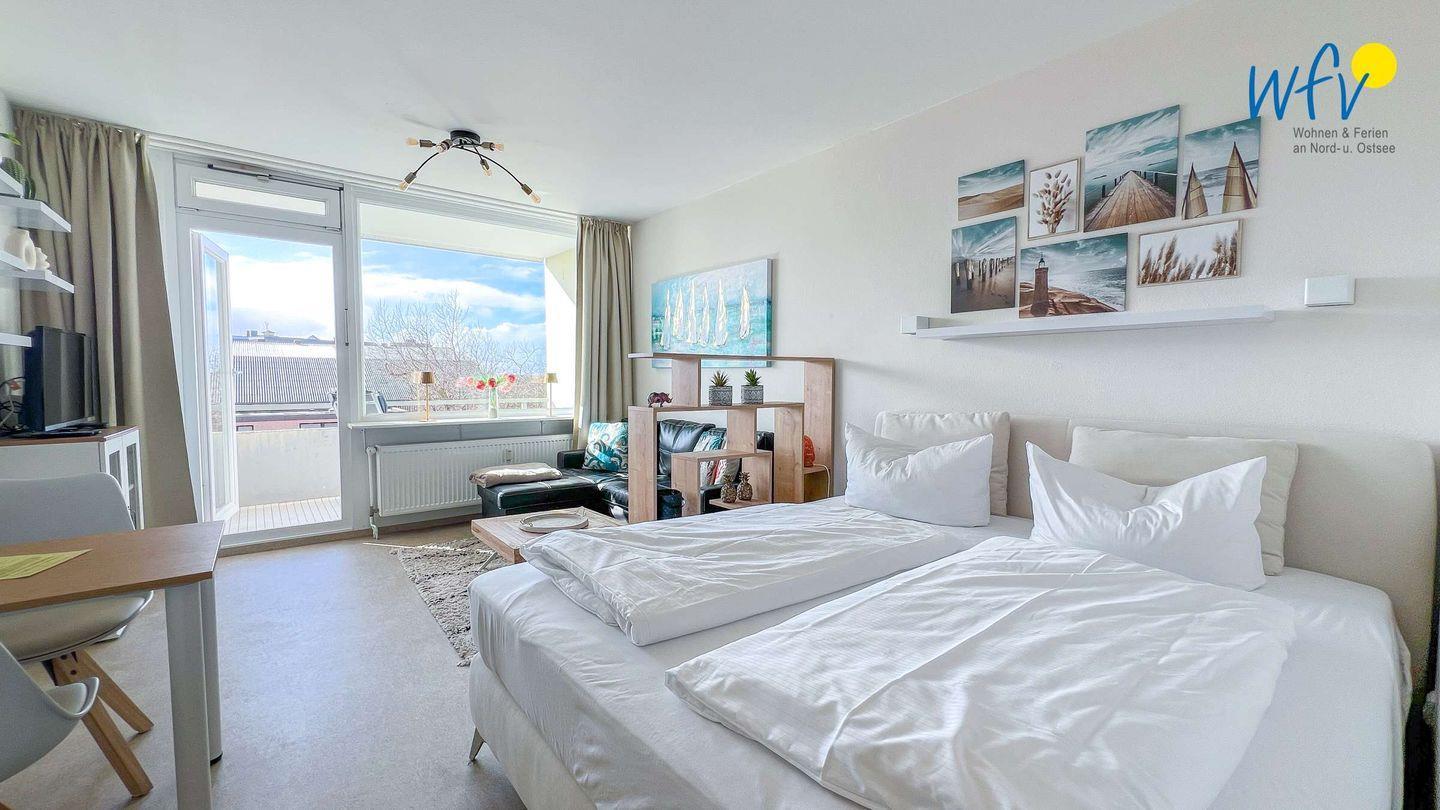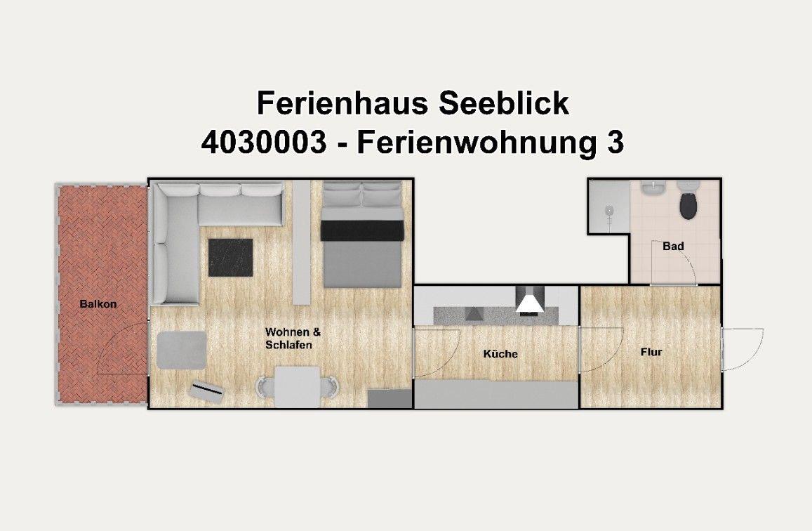 Die Ferienwohnung verfügt über einen Wohnschlafraum mit Couchecke, Essplatz und einem Bett (1,40 x 2,00) sowie über eine Küchenzeile, ein Duschbad und einen Balkon.