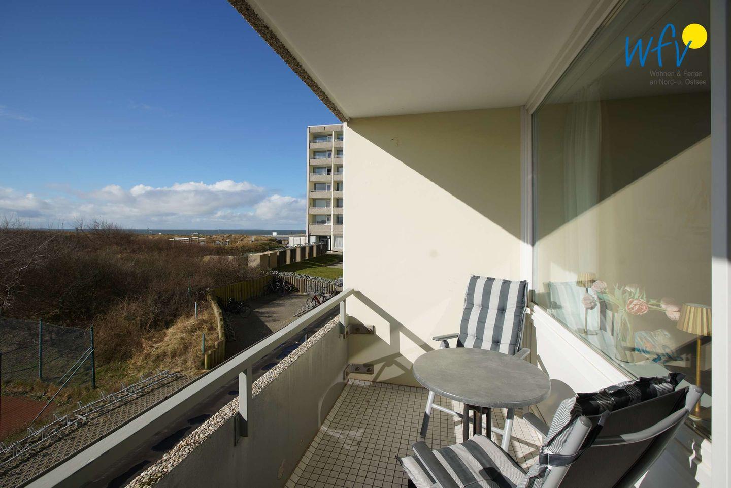 Wohltuende Nordseeluft können Sie auf dem Balkon in bequemen Gartenstühlen genießen. Hier haben Sie Aussicht auf den Tennisplatz und wenn Sie seitlich schauen, sehen Sie sogar schon das Meer!