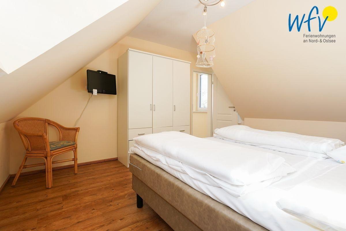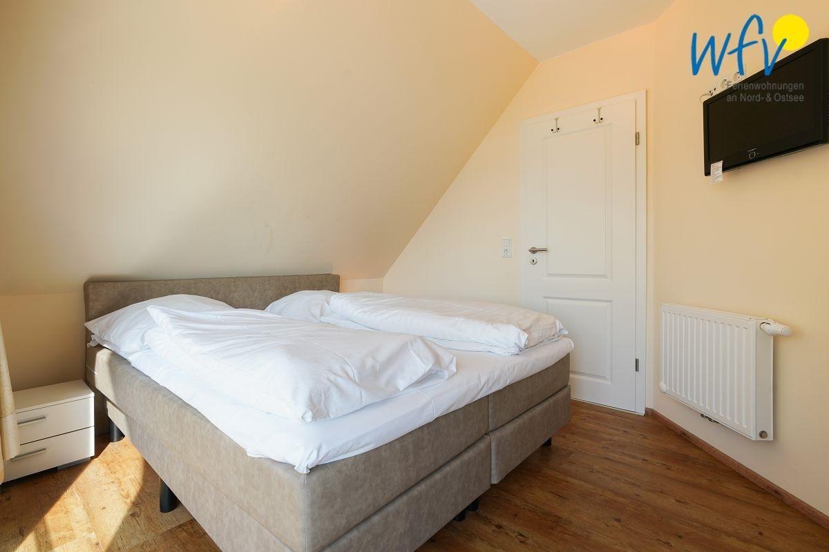 Die beiden separaten Schlafzimmer der Borkumer Ferienwohnung „Gartentraum“ sind jeweils mit einem komfortablen Boxspringbett ausgestattet.