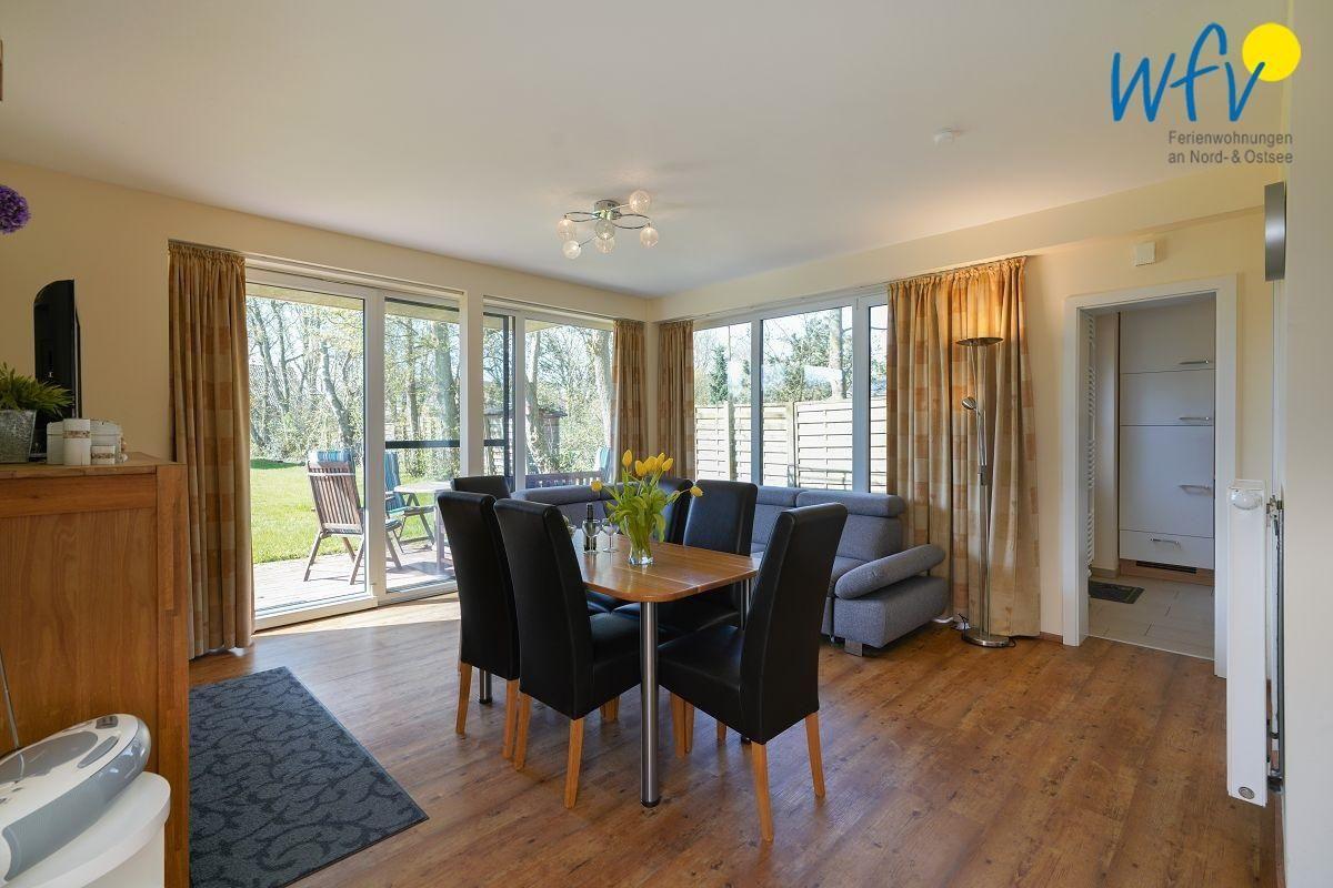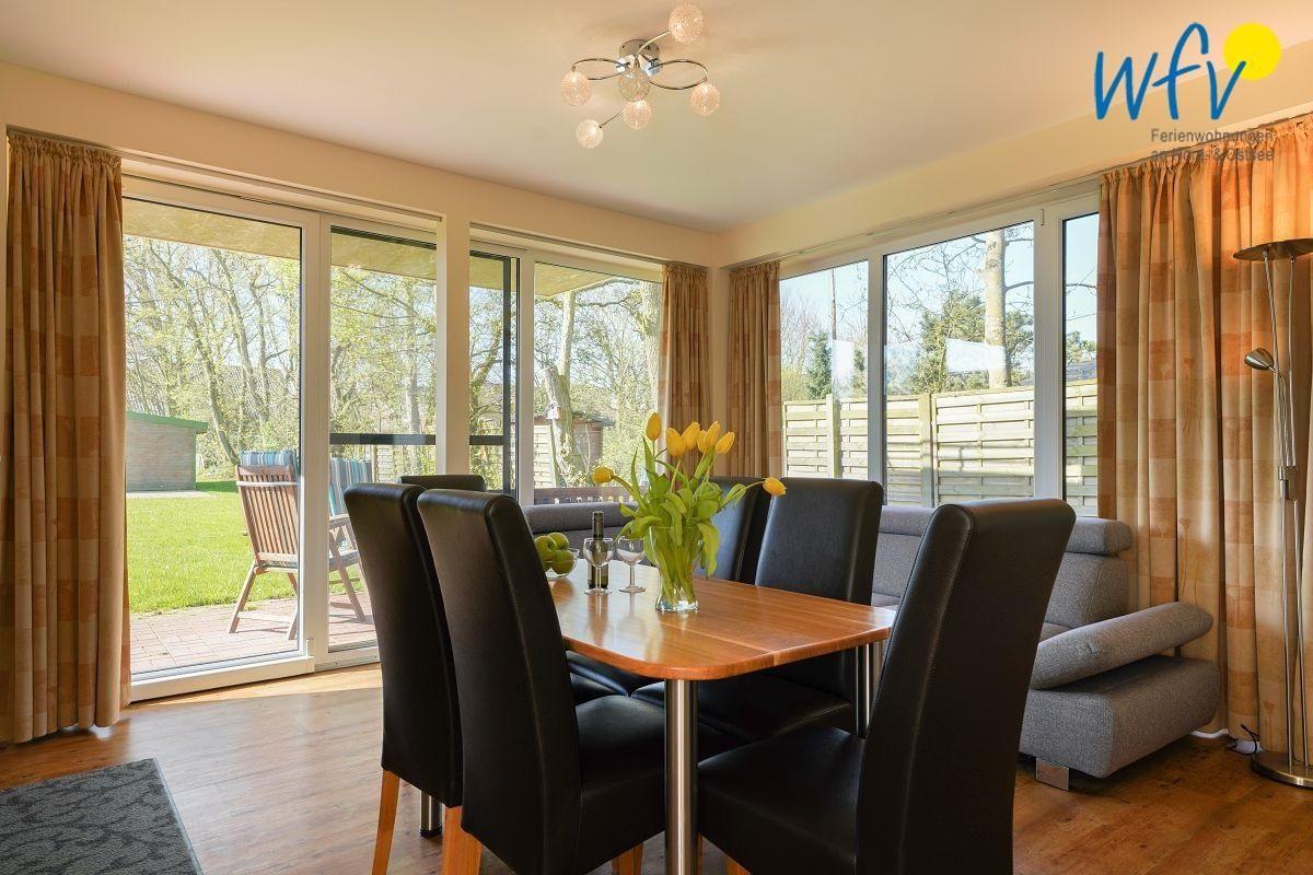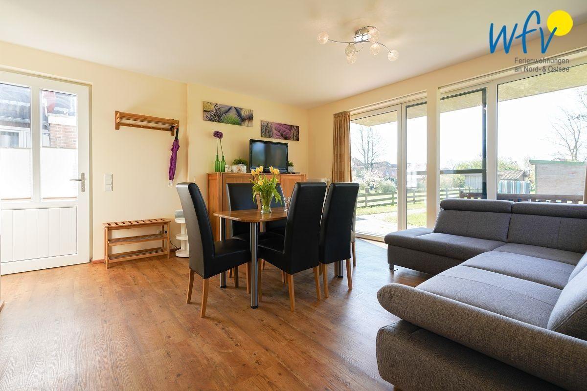 Das Wohnzimmer der Ferienwohnung auf Borkum ist mit einer gemütlichen Couchlandschaft und einem TV sowie mit einem großen Esstisch eingerichtet – hier können Sie wunderbar lustige Spielenachmittage oder gemeinsame Fernsehabende verbringen!