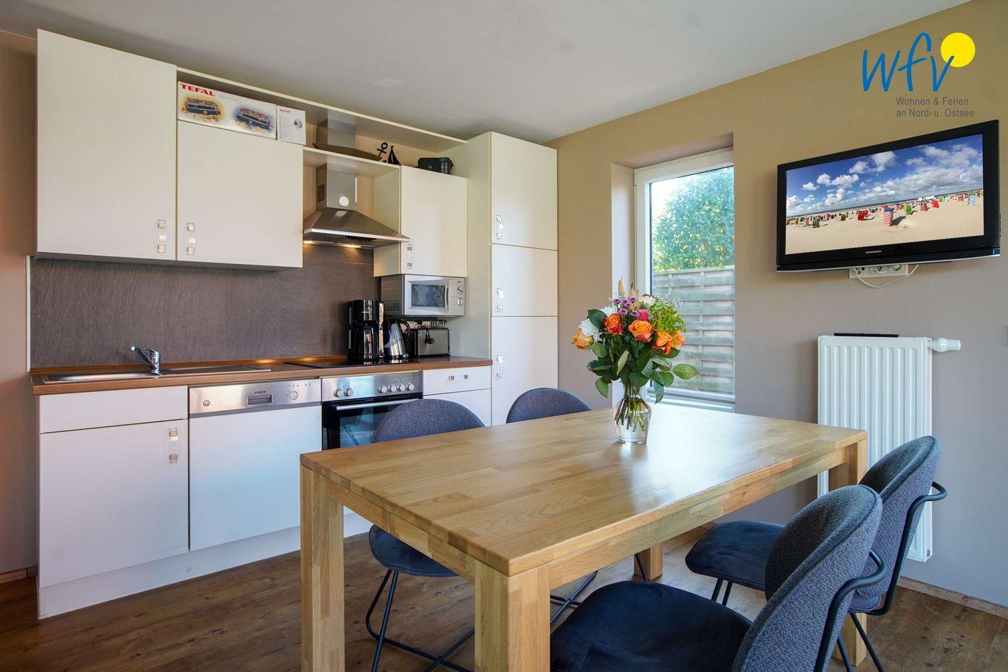 Das Wohnzimmer ist mit einer gemütlichen Sitzecke eingerichtet. Daran angrenzend erwartet Sie eine gut ausgestattete Küche mit großem Esstisch – ideal für gemeinsame Mahlzeiten oder lustige Spielabende!