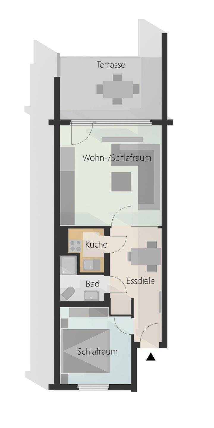 ca. 45 qm große Wohnung mit sep. Schlafzimmer, Schrankbetten im Wohnraum, Sonnenterrasse, kleine Küche mit Essplatz,