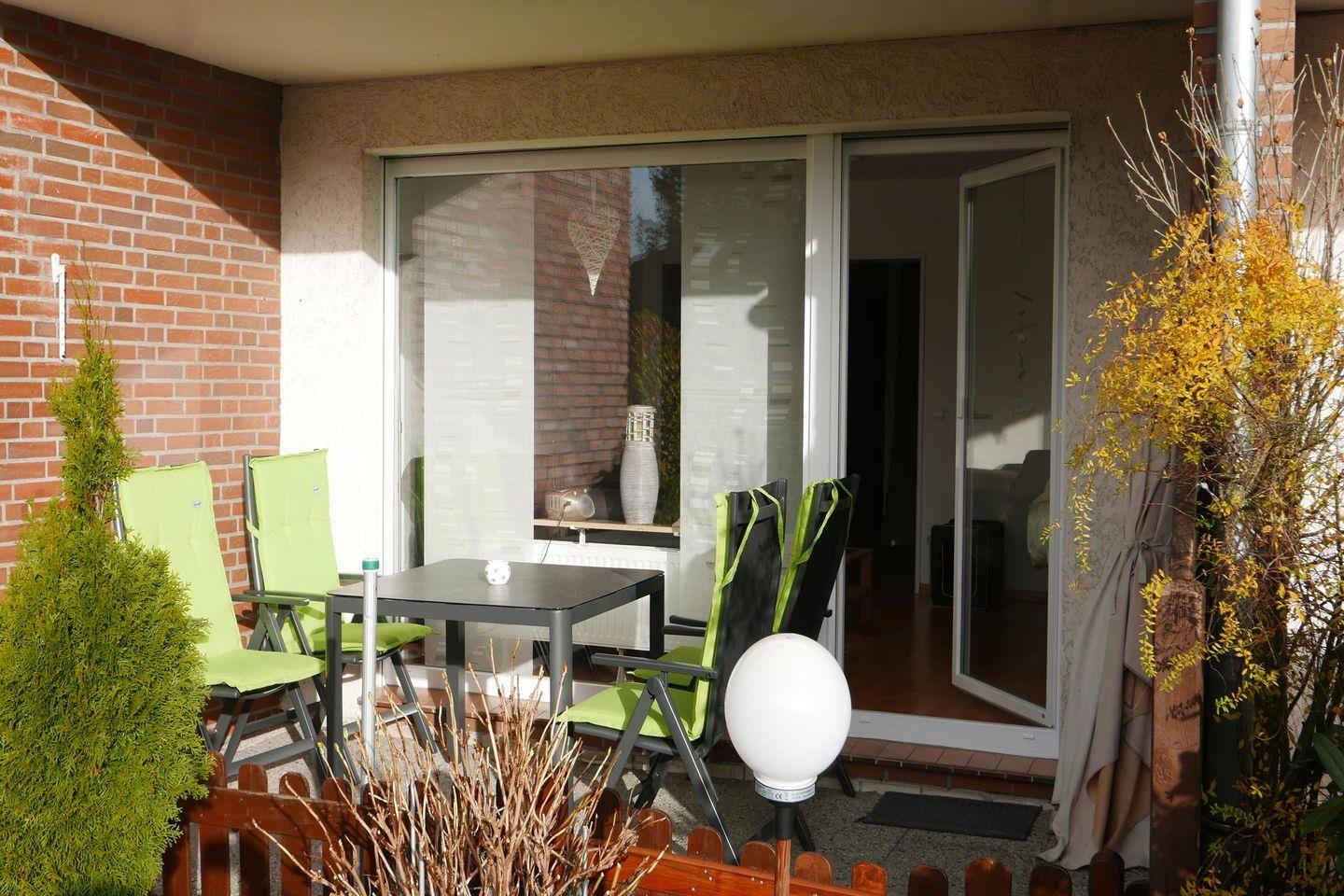 Sie erwartet eine hell und freundlich eingerichtete Wohnung mit einem separaten Schlafzimmer (mit Doppelbett 180x200), ein Bad mit Dusche und WC, eine kleine Küche mit Ceran-Herd, Backofen, Mikrowelle mit Grill, kleine Spülmaschine und Essplatz in der Diele, einem Wohnzimmer mit Schrankbetten und großzügiger Wohnlandschaft in Leder. Der Clou ist die Süd-West ausgerichtete Terrasse.
