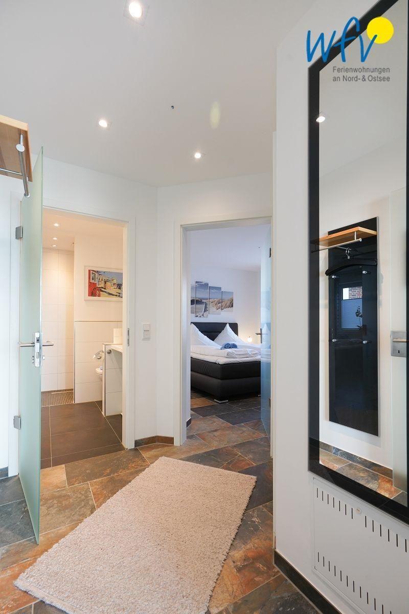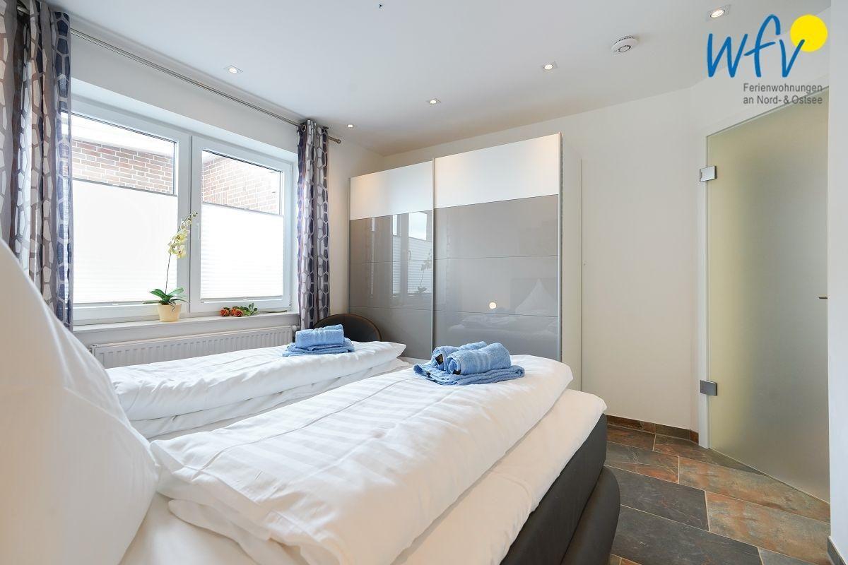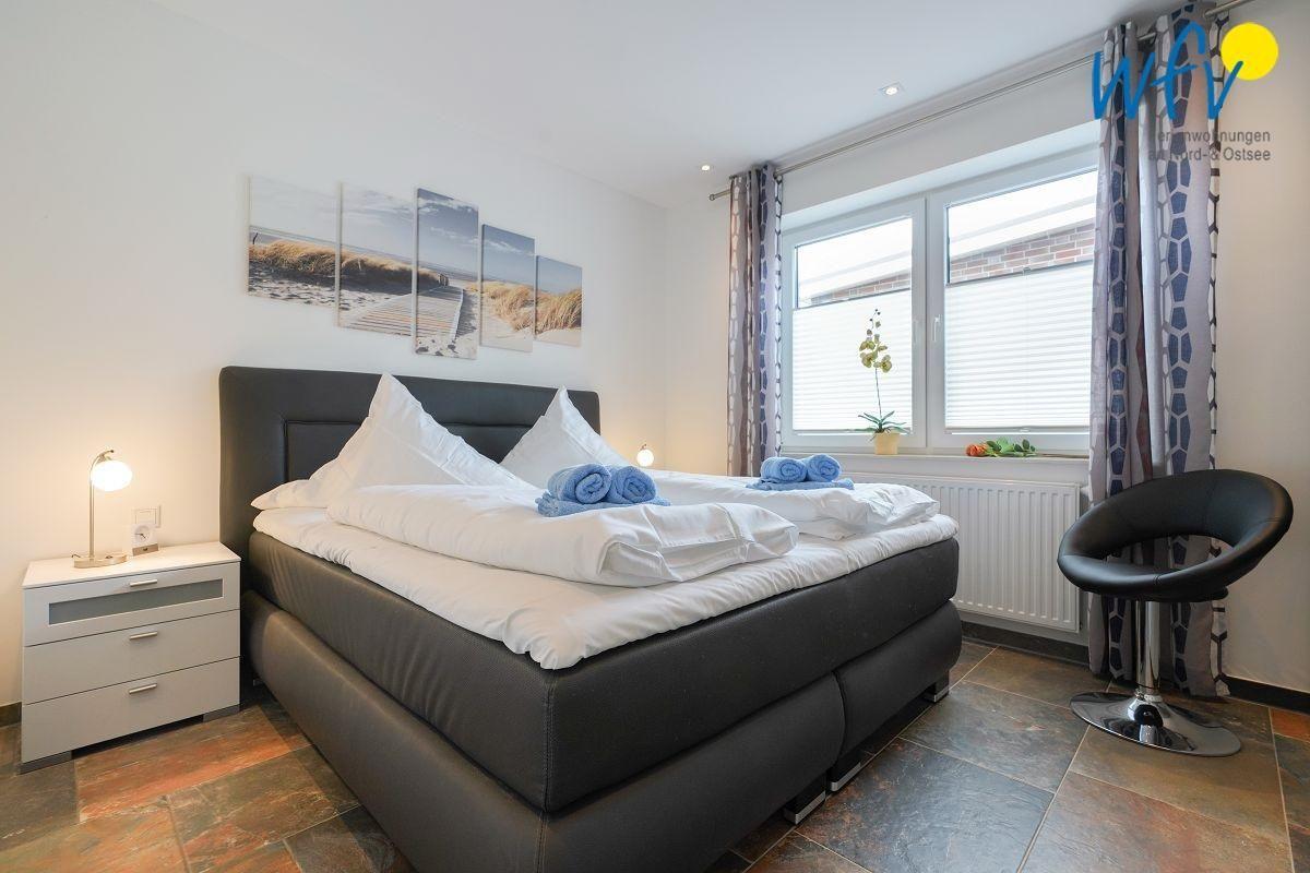 Das separate Schlafzimmer der Borkumer Ferienwohnung ist mit einem modernen Boxspringbett ausgestattet, in dem Sie eine herrlich entspannte Nachtruhe genießen können.