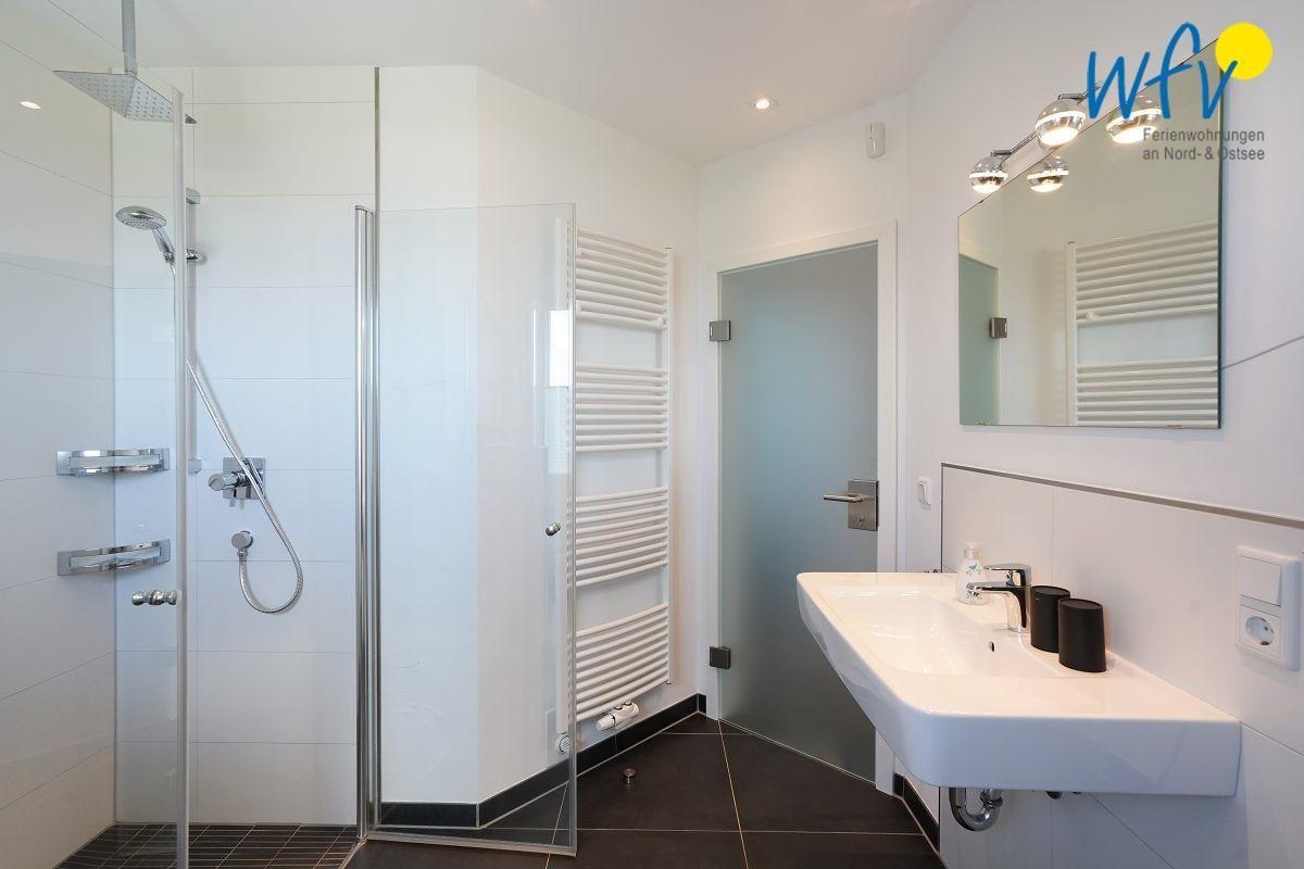 Das moderne Badezimmer verfügt über eine Dusche und ein WC.