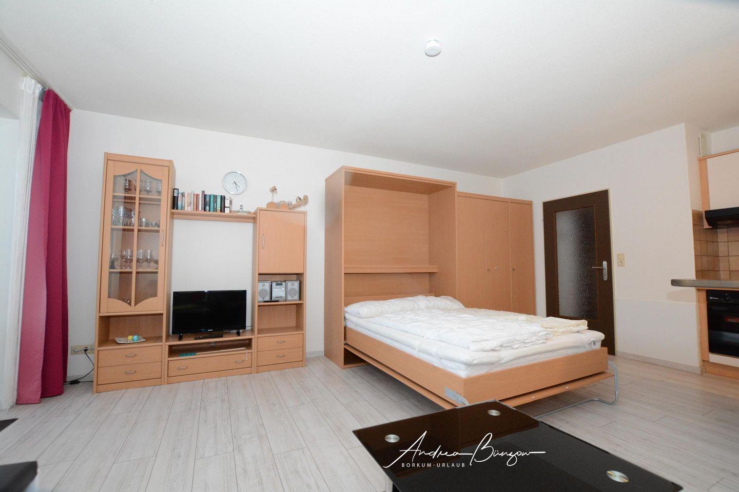 Die 33 qm Nichtraucher- und Haustier freie Ferienwohnung befindet sich in der zweiten Etage und verfügt über einen großzügigen Wohnraum mit Schrankbett, Küchenzeile und Essplatz.