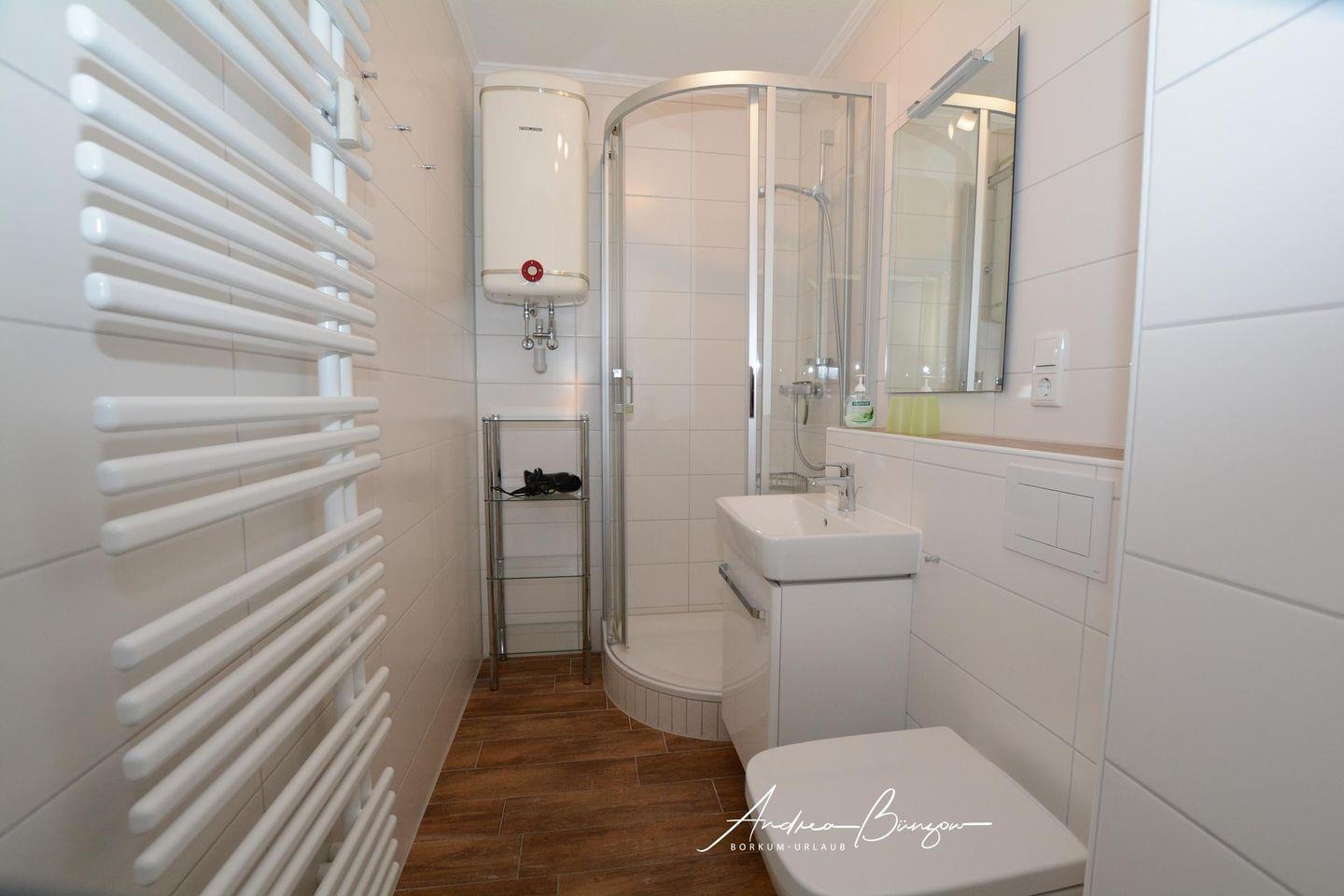 Im Bad ist eine Dusche mit normalem Einstieg, Waschbecken und Toilette.