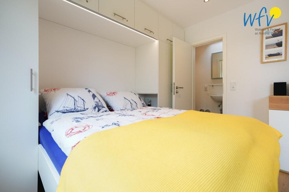 Das Schlafzimmer der Ferienwohnung auf Borkum ist mit einem bequemen Doppelbett und Kleiderschränken sowie mit einem TV und einem CD-Player eingerichtet.