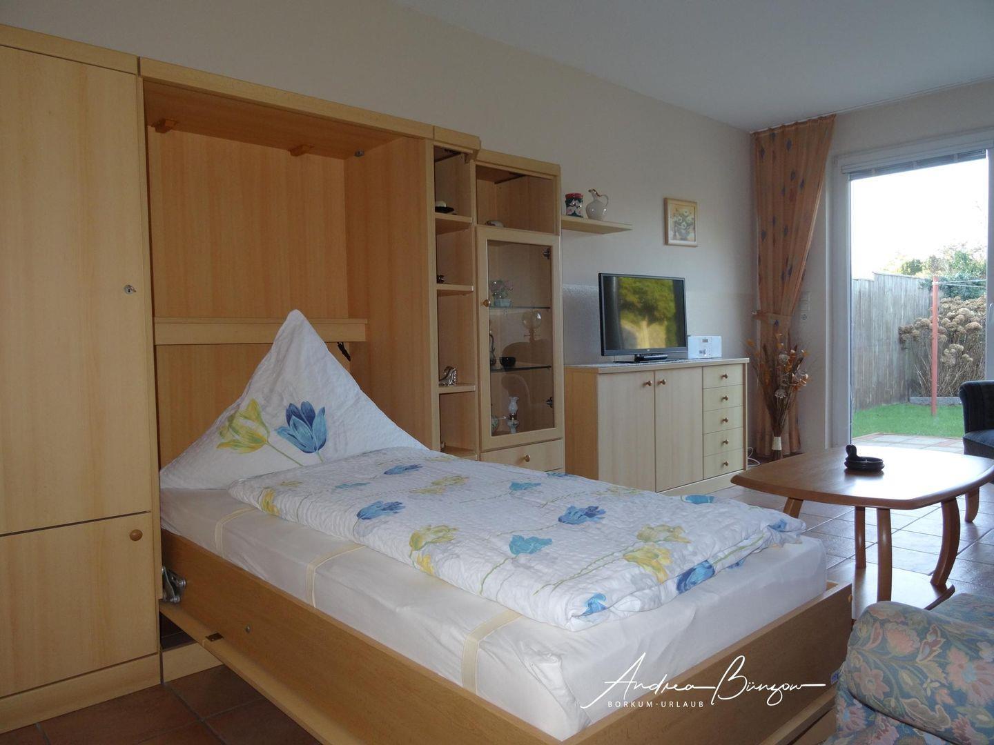 Durch einen kleinen Flur aus der Küche heraus mit Garderobe und Spiegel und dem Eingang zum Badezimmer mit Waschbecken, Dusche und WC gelangen Sie an die Hinterseite des Hauses und damit in das geräumige Wohnzimmer, welches mit einem Schrankbett für eine dritte Person ausgestattet ist. Natürlich befinden sich dort auch Sofa, Sessel und TV. Terrasse und ein kleiner Garten schließen sich hier an, in einem Strandkorb oder in Gartenmöbeln können Sie sich nach langen Spaziergängen wunderbar ausruhen. Der Garten ist dabei gut umzäunt und ganz für Sie allein, Ihre Kinder können ihn ungestört nutzen.