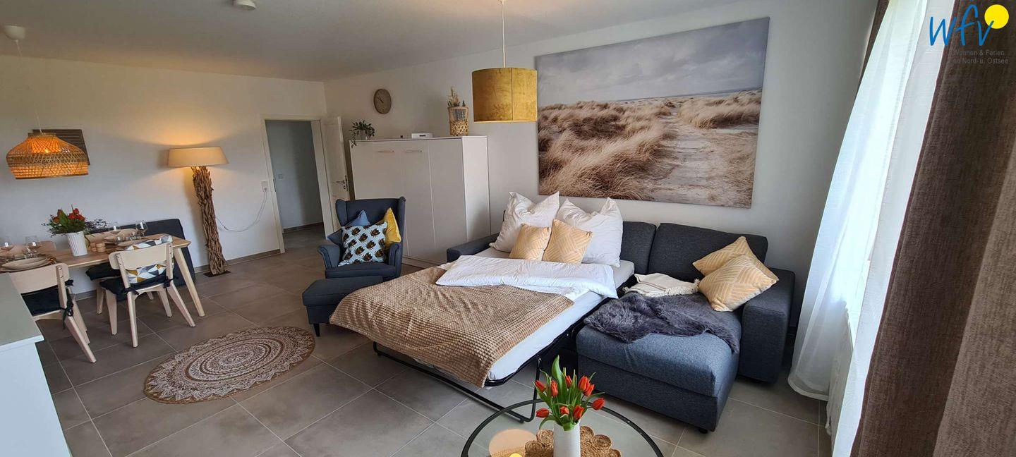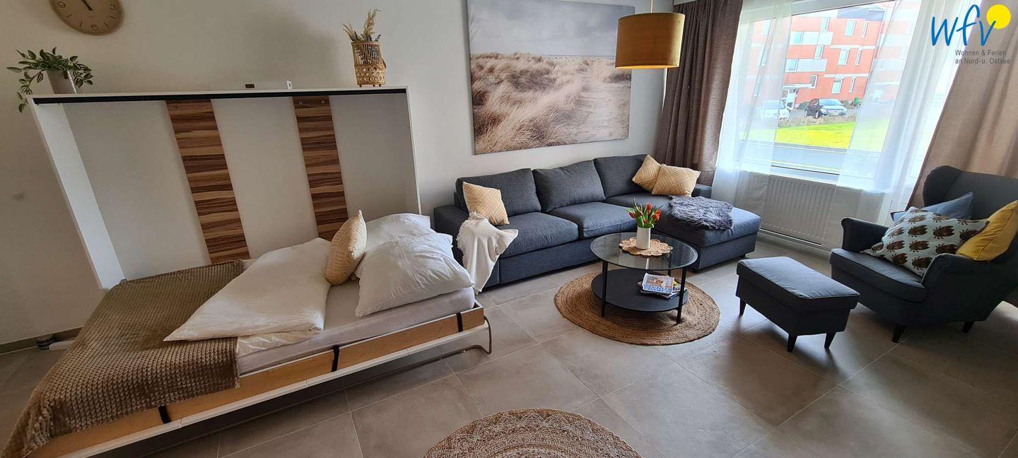 Wenn die Sonne auf Borkum untergeht, warten sehr bequeme Betten auf Sie! In dem separaten Schlafzimmer befindet sich ein Doppel-Boxspringbett (1,80 m x 2 m). Für weitere Schlafmöglichkeiten können Sie im Wohnraum ein Schrankbett und die ausziehbare Eckcouch nutzen (jeweils 1,40 m x 2 m).
