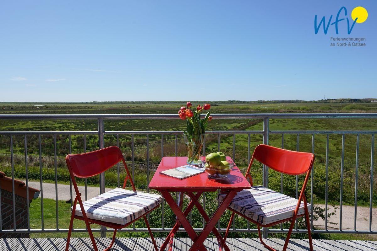 Zeit zum Ausspannen garantiert Ihnen auch der möblierte Balkon der Borkumer Ferienwohnung "Dünenoase"! Bei Sonnenschein, frischer Nordseeluft und einem spannenden Buch können Sie sich in vollen Zügen vom Alltag erholen. Von der Ferienwohnung aus haben Sie einen wunderschönen Ausblick - sowohl auf das Weideland, als auch auf die Dünenlandschaft.