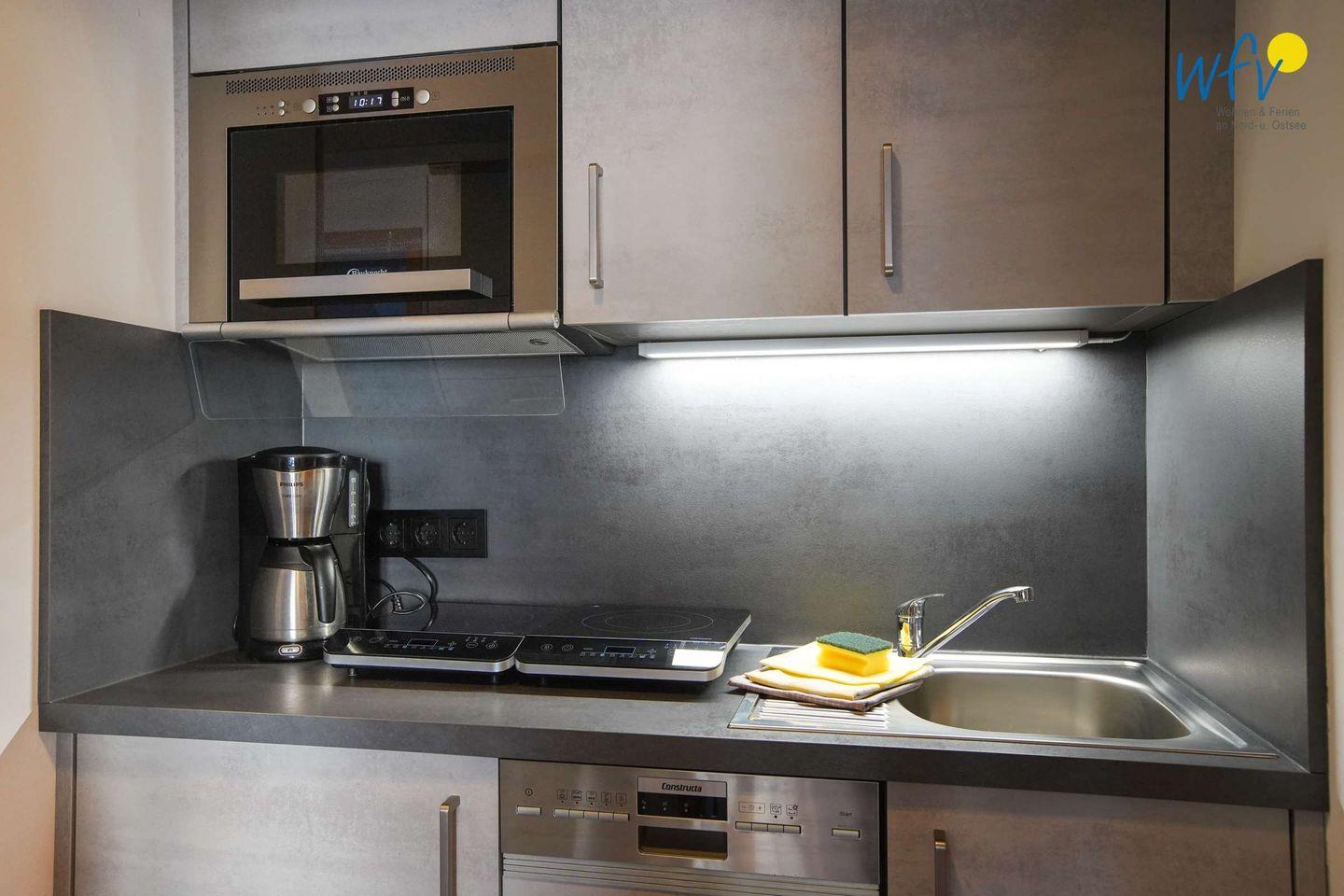 Träumen Sie von frischem Fisch und köstlichen Meeresspezialitäten in Ihrem Borkum-Urlaub? Im nahegelegenen Ortskern und auf der Promenade servieren Ihnen viele Restaurants vorzügliche Gerichte - oftmals auf sonnigen Terrassen mit Meerblick! Für eine bequeme Selbstverpflegung besitzt die Ferienwohnung eine gut ausgestattete Pantryküche (u.a. mit Induktionsherd, Mikrowelle und Spülmaschine).