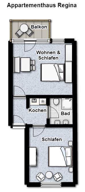 Das Appartement befindet sich im dritten Stock im „Appartement-Haus Regina“, ist ca. 45 m² groß und verfügt über einen Wohnraum mit Essplatz und integrierter Küche, ein separates Schlafzimmer, ein modernes Duschbad mit Doppelwaschtisch und einen überdachten Balkon. Modernes Mobiliar und frisch gestrichene Wände sowie freies Wlan, zwei Fernseher und Gesellschaftsspiele sorgen für zusätzlichen Wohnkomfort. So wird das gemütliche Appartement zu Ihrer persönlichen Wohlfühloase für die ganze Familie!