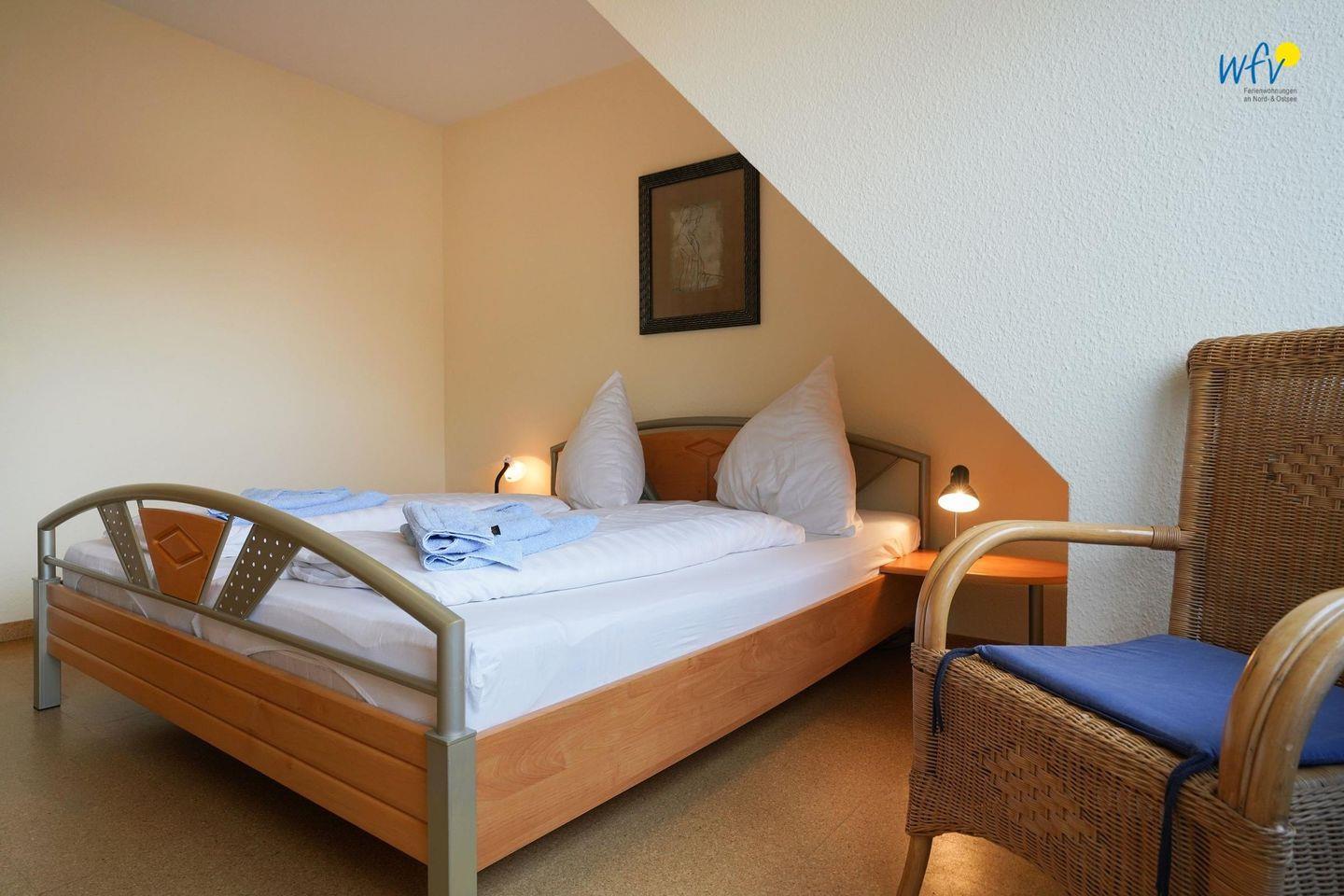Die zwei separaten Schlafzimmer der Borkumer Ferienwohnung sind mit einem Doppelbett bzw. zwei Einzelbetten ausgestattet.
