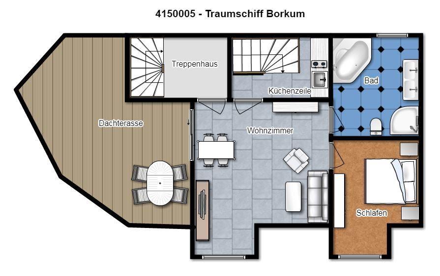 Im Herzen von Borkum befindet sich das Haus "Traumschiff Borkum" mit der geräumigen Maisonette-Wohnung „Oberdeck“.