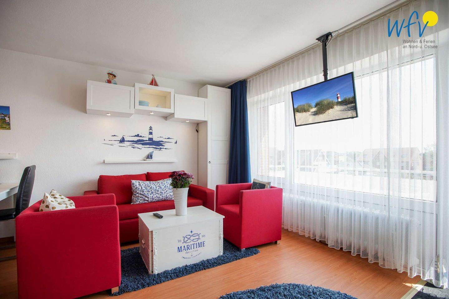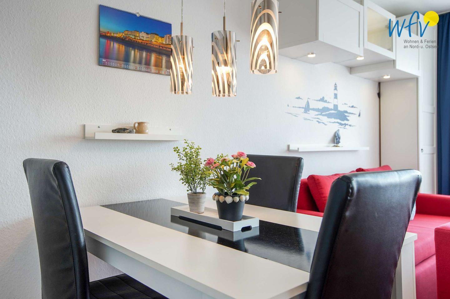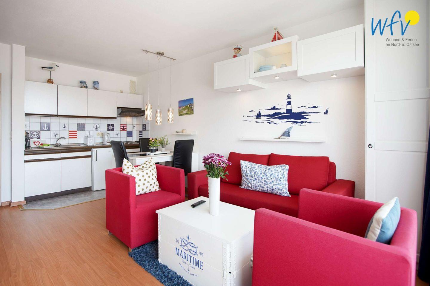 Es erwartet Sie ein komfortabler Wohnraum mit Couchecke und TV, Schlafmöglichkeiten für drei Personen und einer integrierten Küchenzeile mit Essbereich. Eine liebevolle Einrichtung und ein malerischer Blick auf den Leuchtturm machen die Ferienwohnung zu Ihrer persönlichen Wohlfühloase auf Borkum!