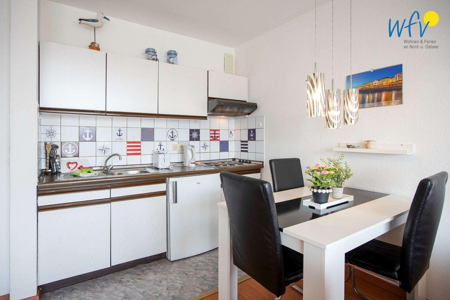 Für eine bequeme Selbstverpflegung in Ihrem Urlaub ist die Küchenzeile u.a. mit einem Vier-Platten-Herd, einem Kühlschrank mit Gefrierfach und einer Mikrowelle ausgestattet. Außerdem sind diverse Kleingeräte wie eine Filterkaffeemaschine und eine Senseo- Kaffeemaschine, ein Wasserkocher und ein Toaster vorhanden. Sie können sich aber auch wunderbar kulinarisch verwöhnen lassen: Auf Borkum servieren Ihnen zahlreiche Restaurants köstliche Nordseegerichte. Frische Frühstücksbrötchen bekommen Sie beim Bäcker direkt vor dem Haus!