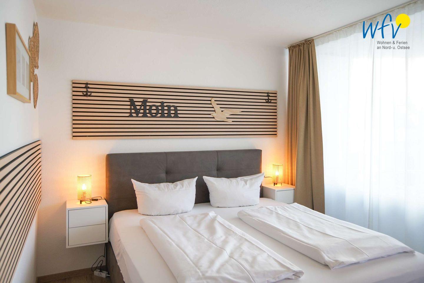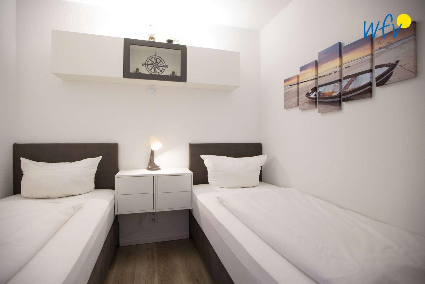 In dem separaten Schlafzimmer der Borkumer Ferienwohnung befinden sich zwei Einzelbetten. Durch Schrankbetten im Wohnbereich bestehen Schlafmöglichkeiten für zwei weitere Personen. Zum festen Inventar gehören ein Babybett und Kinderspielzeug.
