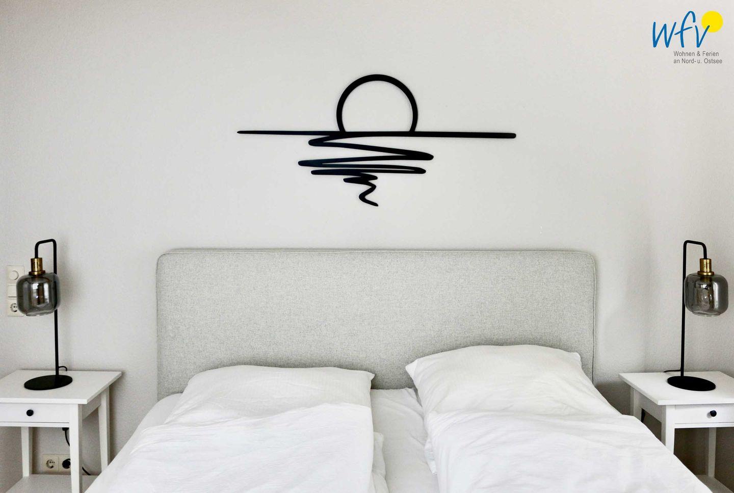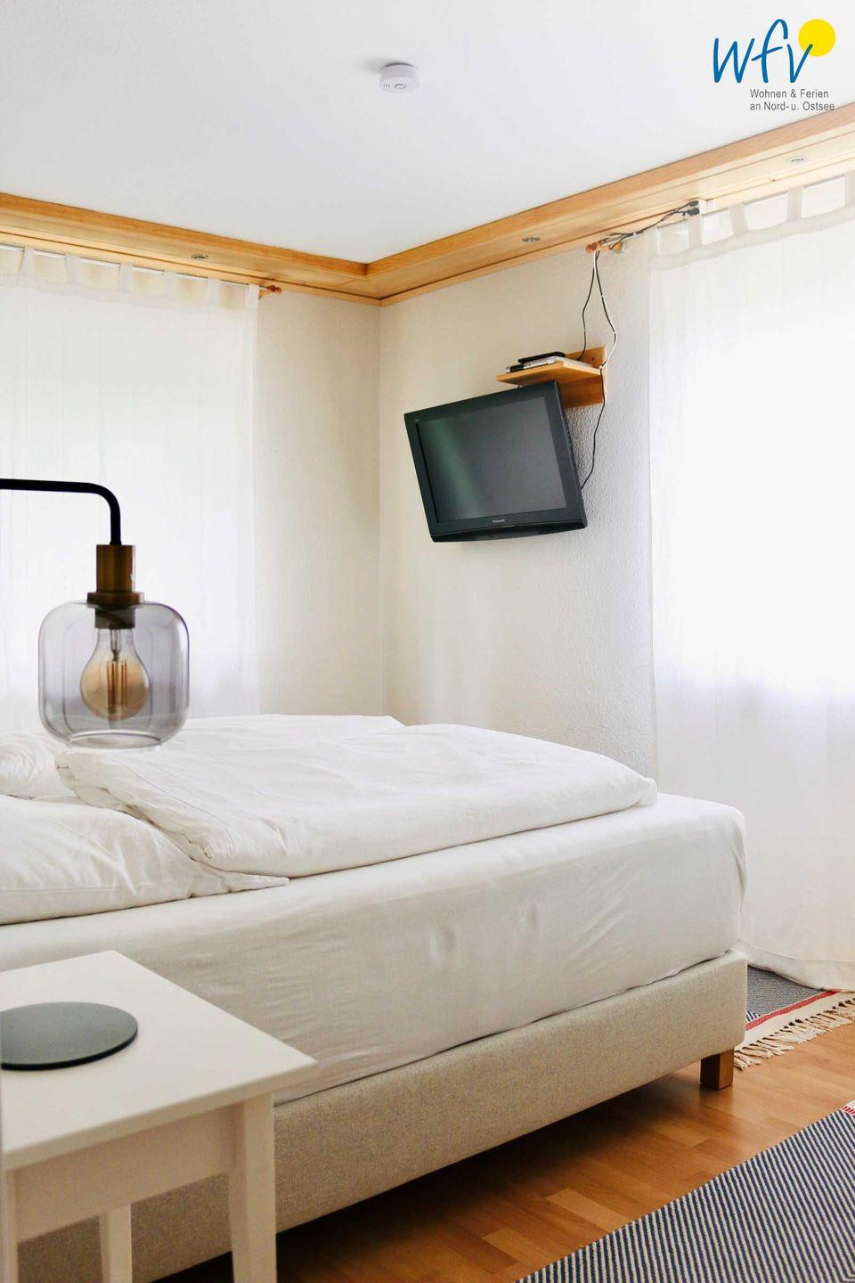 Die Borkumer Ferienwohnung verfügt über ein separates Schlafzimmer, das mit einem hochwertigen Boxspringbett mit einem durchgehenden Topper (180 x 200 cm) eingerichtet ist. Ein geräumiger Kleiderschrank für die Urlaubsgarderobe und ein TV zum gemütlichen Fernsehen komplettieren die Ausstattung. Schlafmöglichkeiten für zwei weitere Personen bestehen durch eine Schlafcouch im Wohnbereich (1,60 m x 2 m).